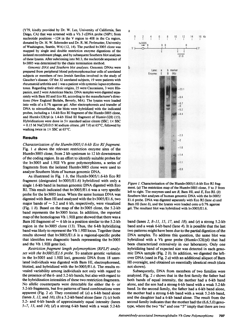 Efforts to determine the role of specific Ig variable region (V) genes in human autoimmune responses have been hampered by the lack of suitably polymorphic probes. Recently we isolated a heavy chain V (Vh) gene, designated Humhv3005, that is 99% homologous to the 1.9III Vh gene and can encode an anti-DNA antibody. To study the relation between these two genes, different DNA fragments from the isolated Humhv3005 clone were used to probe Southern blots of human genomic DNA. A 1.6-kb Eco RI fragment (designated hv3005/E1.6) was found to hybridize with only one band in Eco RI-digested DNA, and with two major bands in Bam HI-digested DNA. Importantly, the sizes of the latter two bands were indistinguishable from the corresponding Bam HI fragment sizes of the isolated hv3005 clone and the isolated 1.9III clone, respectively. Population and family studies with the hv3005/E1.6 probe revealed five different hybridization patterns of these two characteristic bands, which defined nine possible genotypes for two human Ig Vh gene loci. Together the data demonstrate that hv3005/E1.6 is a highly informative probe for an autoantibody-associated Vh gene(s), and should prove useful in elucidating the role of Ig Vh genes in autoimmune diseases.