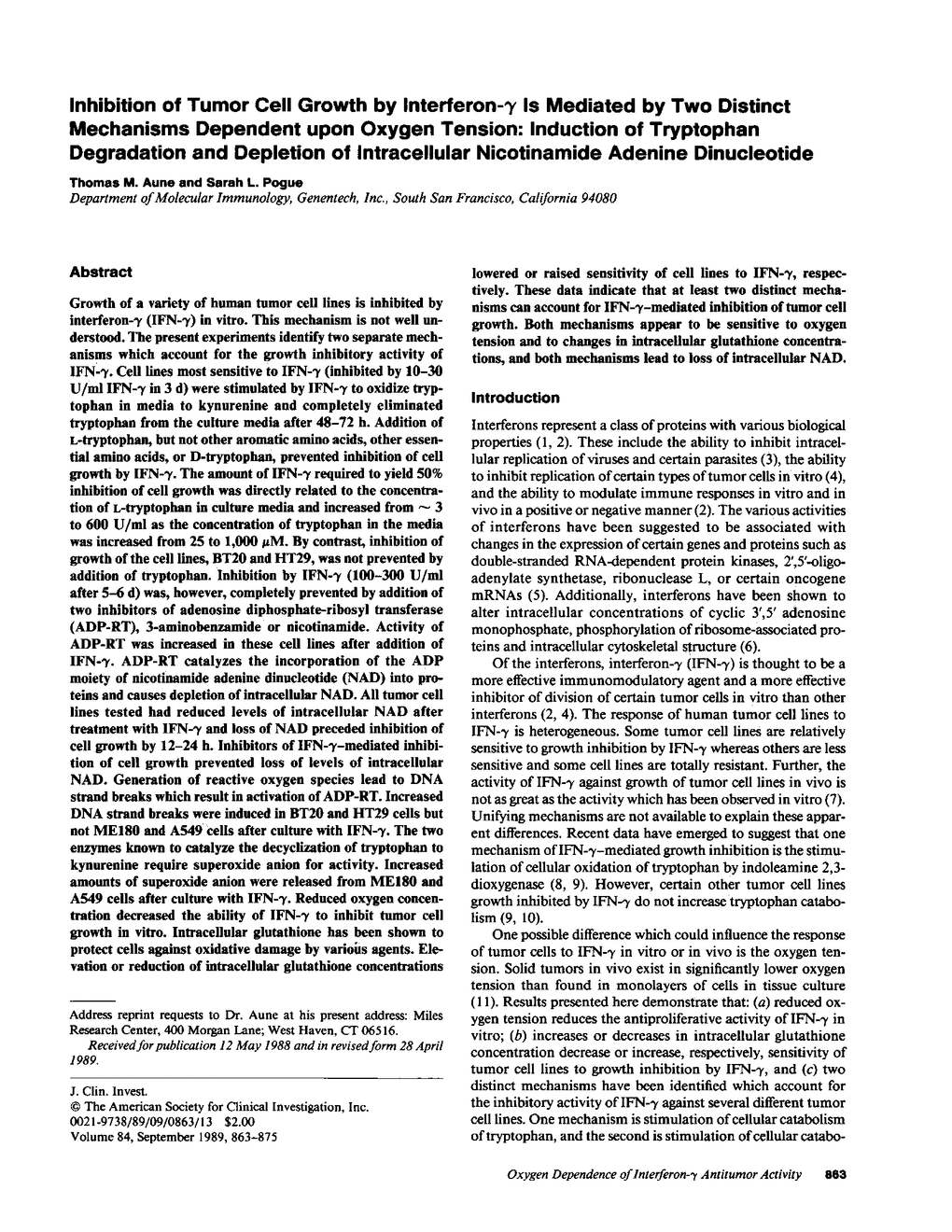 Growth of a variety of human tumor cell lines is inhibited by interferon-gamma (IFN-gamma) in vitro. This mechanism is not well understood. The present experiments identify two separate mechanisms which account for the growth inhibitory activity of IFN-gamma. Cell lines most sensitive to IFN-gamma (inhibited by 10-30 U/ml IFN-gamma in 3 d) were stimulated by IFN-gamma to oxidize tryptophan in media to kynurenine and completely eliminated tryptophan from the culture media after 48-72 h. Addition of L-tryptophan, but not other aromatic amino acids, other essential amino acids, or D-tryptophan, prevented inhibition of cell growth by IFN-gamma. The amount of IFN-gamma required to yield 50% inhibition of cell growth was directly related to the concentration of L-tryptophan in culture media and increased from approximately 3 to 600 U/ml as the concentration of tryptophan in the media was increased from 25 to 1,000 microM. By contrast, inhibition of growth of the cell lines, BT20 and HT29, was not prevented by addition of tryptophan. Inhibition by IFN-gamma (100-300 U/ml after 5-6 d) was, however, completely prevented by addition of two inhibitors of adenosine diphosphate-ribosyl transferase (ADP-RT), 3-aminobenzamide or nicotinamide. Activity of ADP-RT was increased in these cell lines after addition of IFN-gamma. ADP-RT catalyzes the incorporation of the ADP moiety of nicotinamide adenine dinucleotide (NAD) into proteins and causes depletion of intracellular NAD. All tumor cell lines tested had reduced levels of intracellular NAD after treatment with IFN-gamma and loss of NAD preceded inhibition of cell growth by 12-24 h. Inhibitors of IFN-gamma-mediated inhibition of cell growth prevented loss of levels of intracellular NAD. Generation of reactive oxygen species lead to DNA strand breaks which result in activation of ADP-RT. Increased DNA strand breaks were induced in BT20 and HT29 cells but not ME180 and A549 cells after culture with IFN-gamma. The two enzymes known to catalyze the decyclization of tryptophan to kynurenine require superoxide anion for activity. Increased amounts of superoxide anion were released from ME180 and A549 cells after culture with IFN-gamma. Reduced oxygen concentration decreased the ability of IFN-gamma to inhibit tumor cell growth in vitro. Intracellular glutathione has been shown to protect cells against oxidative damage by various agents. Elevation or reduction of intracellular glutathione concentrations lowered or raised sensitivity of cell lines to IFN-gamma, respectively. These data indicate that at least two distinct mechanisms can account for IFN-gamma-madiated inhibition of tumor cell growth. Both mechanisms appear to be sensitive to oxygen tension and to changes in intracellular glutathione concentrations, and both mechanisms lead to loss of intracellular NAD.