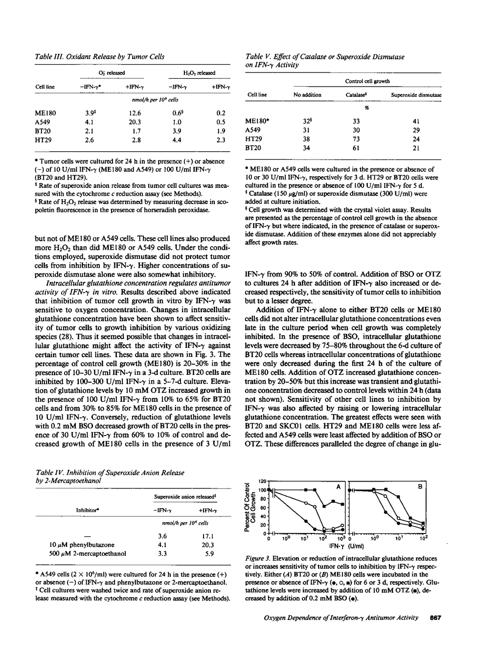 Growth of a variety of human tumor cell lines is inhibited by interferon-gamma (IFN-gamma) in vitro. This mechanism is not well understood. The present experiments identify two separate mechanisms which account for the growth inhibitory activity of IFN-gamma. Cell lines most sensitive to IFN-gamma (inhibited by 10-30 U/ml IFN-gamma in 3 d) were stimulated by IFN-gamma to oxidize tryptophan in media to kynurenine and completely eliminated tryptophan from the culture media after 48-72 h. Addition of L-tryptophan, but not other aromatic amino acids, other essential amino acids, or D-tryptophan, prevented inhibition of cell growth by IFN-gamma. The amount of IFN-gamma required to yield 50% inhibition of cell growth was directly related to the concentration of L-tryptophan in culture media and increased from approximately 3 to 600 U/ml as the concentration of tryptophan in the media was increased from 25 to 1,000 microM. By contrast, inhibition of growth of the cell lines, BT20 and HT29, was not prevented by addition of tryptophan. Inhibition by IFN-gamma (100-300 U/ml after 5-6 d) was, however, completely prevented by addition of two inhibitors of adenosine diphosphate-ribosyl transferase (ADP-RT), 3-aminobenzamide or nicotinamide. Activity of ADP-RT was increased in these cell lines after addition of IFN-gamma. ADP-RT catalyzes the incorporation of the ADP moiety of nicotinamide adenine dinucleotide (NAD) into proteins and causes depletion of intracellular NAD. All tumor cell lines tested had reduced levels of intracellular NAD after treatment with IFN-gamma and loss of NAD preceded inhibition of cell growth by 12-24 h. Inhibitors of IFN-gamma-mediated inhibition of cell growth prevented loss of levels of intracellular NAD. Generation of reactive oxygen species lead to DNA strand breaks which result in activation of ADP-RT. Increased DNA strand breaks were induced in BT20 and HT29 cells but not ME180 and A549 cells after culture with IFN-gamma. The two enzymes known to catalyze the decyclization of tryptophan to kynurenine require superoxide anion for activity. Increased amounts of superoxide anion were released from ME180 and A549 cells after culture with IFN-gamma. Reduced oxygen concentration decreased the ability of IFN-gamma to inhibit tumor cell growth in vitro. Intracellular glutathione has been shown to protect cells against oxidative damage by various agents. Elevation or reduction of intracellular glutathione concentrations lowered or raised sensitivity of cell lines to IFN-gamma, respectively. These data indicate that at least two distinct mechanisms can account for IFN-gamma-madiated inhibition of tumor cell growth. Both mechanisms appear to be sensitive to oxygen tension and to changes in intracellular glutathione concentrations, and both mechanisms lead to loss of intracellular NAD.