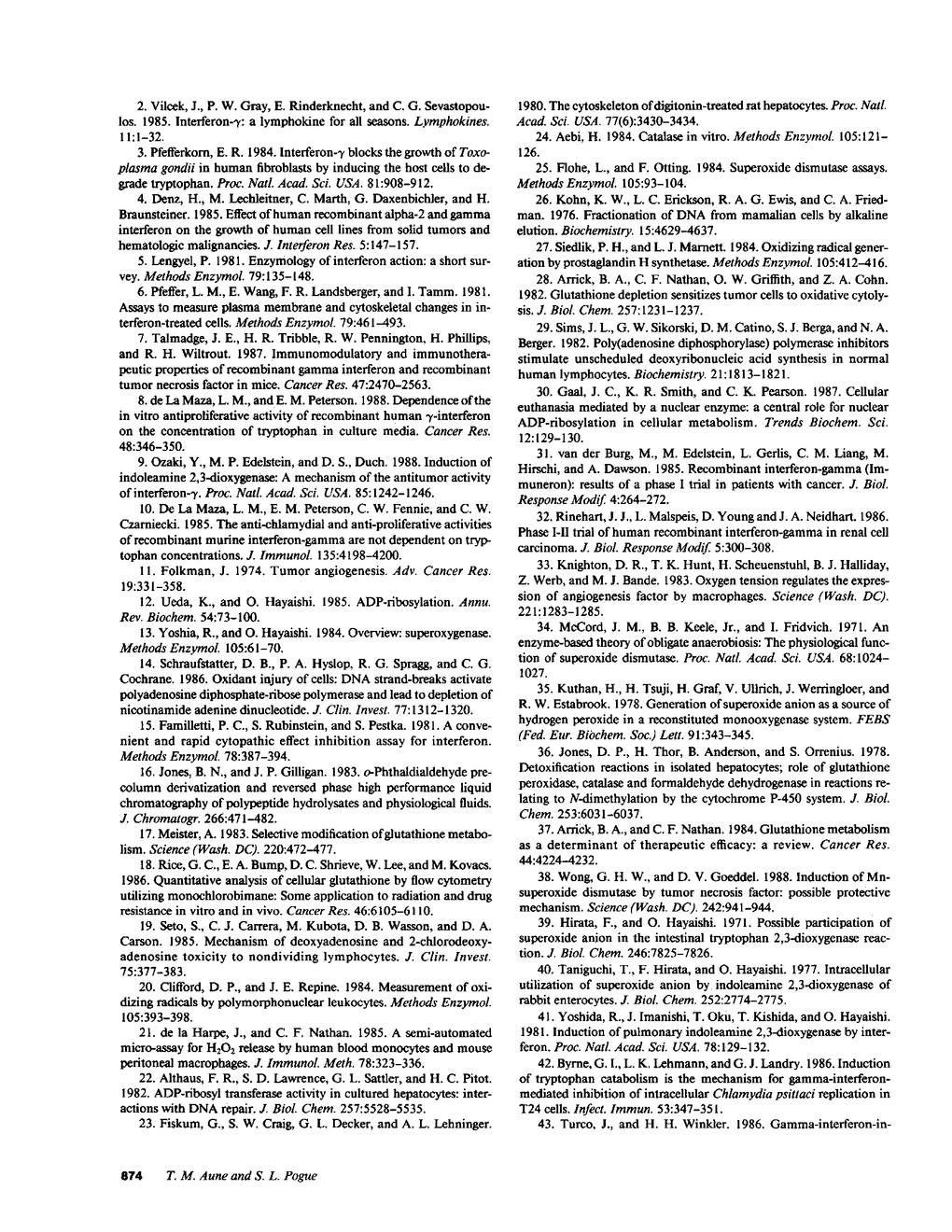 Growth of a variety of human tumor cell lines is inhibited by interferon-gamma (IFN-gamma) in vitro. This mechanism is not well understood. The present experiments identify two separate mechanisms which account for the growth inhibitory activity of IFN-gamma. Cell lines most sensitive to IFN-gamma (inhibited by 10-30 U/ml IFN-gamma in 3 d) were stimulated by IFN-gamma to oxidize tryptophan in media to kynurenine and completely eliminated tryptophan from the culture media after 48-72 h. Addition of L-tryptophan, but not other aromatic amino acids, other essential amino acids, or D-tryptophan, prevented inhibition of cell growth by IFN-gamma. The amount of IFN-gamma required to yield 50% inhibition of cell growth was directly related to the concentration of L-tryptophan in culture media and increased from approximately 3 to 600 U/ml as the concentration of tryptophan in the media was increased from 25 to 1,000 microM. By contrast, inhibition of growth of the cell lines, BT20 and HT29, was not prevented by addition of tryptophan. Inhibition by IFN-gamma (100-300 U/ml after 5-6 d) was, however, completely prevented by addition of two inhibitors of adenosine diphosphate-ribosyl transferase (ADP-RT), 3-aminobenzamide or nicotinamide. Activity of ADP-RT was increased in these cell lines after addition of IFN-gamma. ADP-RT catalyzes the incorporation of the ADP moiety of nicotinamide adenine dinucleotide (NAD) into proteins and causes depletion of intracellular NAD. All tumor cell lines tested had reduced levels of intracellular NAD after treatment with IFN-gamma and loss of NAD preceded inhibition of cell growth by 12-24 h. Inhibitors of IFN-gamma-mediated inhibition of cell growth prevented loss of levels of intracellular NAD. Generation of reactive oxygen species lead to DNA strand breaks which result in activation of ADP-RT. Increased DNA strand breaks were induced in BT20 and HT29 cells but not ME180 and A549 cells after culture with IFN-gamma. The two enzymes known to catalyze the decyclization of tryptophan to kynurenine require superoxide anion for activity. Increased amounts of superoxide anion were released from ME180 and A549 cells after culture with IFN-gamma. Reduced oxygen concentration decreased the ability of IFN-gamma to inhibit tumor cell growth in vitro. Intracellular glutathione has been shown to protect cells against oxidative damage by various agents. Elevation or reduction of intracellular glutathione concentrations lowered or raised sensitivity of cell lines to IFN-gamma, respectively. These data indicate that at least two distinct mechanisms can account for IFN-gamma-madiated inhibition of tumor cell growth. Both mechanisms appear to be sensitive to oxygen tension and to changes in intracellular glutathione concentrations, and both mechanisms lead to loss of intracellular NAD.