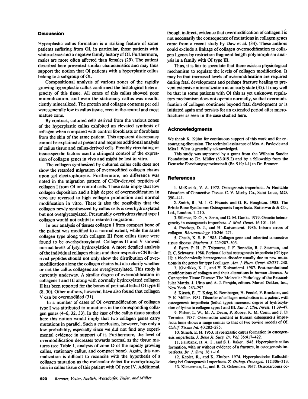 We analyzed tissue and cells from a stationary and a rapidly growing hyperplastic callus from a patient with osteogenesis imperfecta (OI) type IV and compared the results with those of compact bone and skin fibroblasts of an age-matched control. Collagen and protein contents per cell were low in the callus tissues and collagen I and III were overmodified as evidenced by an elevated level of hydroxylysine. The degree of lysyl hydroxylation was highest in those regions that appeared most immature by histological examination. Lysyl hydroxylation approached normal levels in collagen from the stationary callus and from the center of the growing callus. Overmodification of collagen was not seen in compact bone or cell cultures (neither skin fibroblasts nor callus cells) from the patient. Elevation of hydroxylysine in collagen from OI patients is generally attributed to mutations that delay triple helix formation. Our observations suggest that the varying degree of collagen modifications may occur in consequence of regulatory mechanisms during bone development and tissue repair. These mechanisms may be defective in some patients with OI as seen in this case with hyperplastic callus formation.