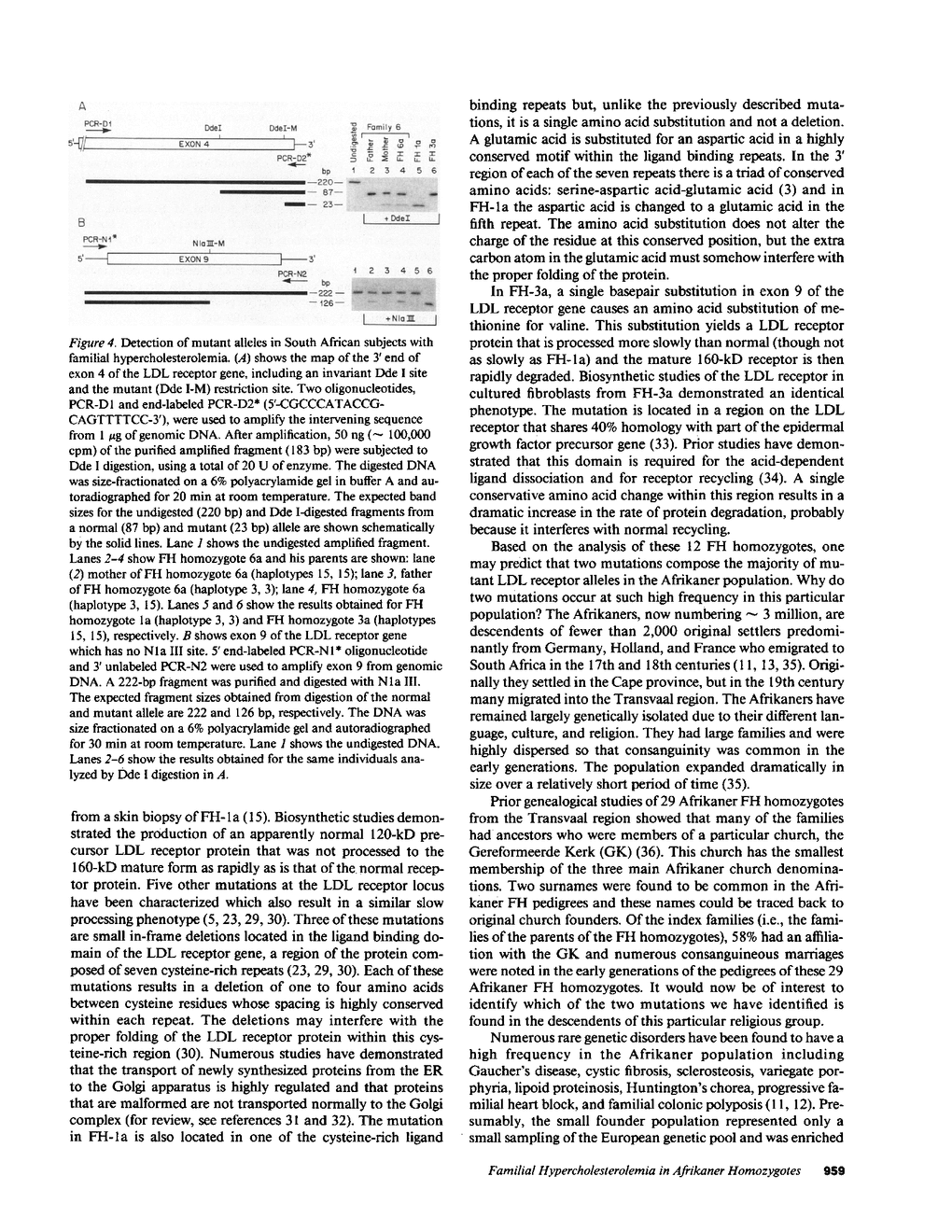 Familial hypercholesterolemia (FH), an autosomal dominant disease caused by mutations in the LDL receptor gene, is five times more frequent in the Afrikaner population of South Africa than it is in the population of the United States and Europe. It has been proposed that the high frequency is due to a founder effect. In this paper, we characterized 24 mutant LDL receptor alleles from 12 Afrikaner individuals homozygous for FH. We identified two mutations that together makeup greater than 95% of the mutant LDL receptor genes represented in our sample. Both mutations were basepair substitutions that result in single-amino acid changes. Each mutation can be detected readily with the polymerase chain reaction and restriction analysis. The finding of two common LDL receptor mutations in the Afrikaner FH homozygotes predicts that these mutations will predominate in the Afrikaner population and that the high frequency of FH is due to a founder effect. The increased incidence of ischemic heart disease in the Afrikaner population may in part be due to the high frequency of these two mutations in the LDL receptor gene.