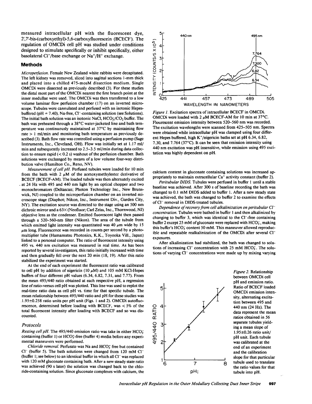 The collecting duct of the inner stripe outer medulla (OMCDi) is a major site of distal nephron acidification. Using the pH sensitive fluorescent dye 2'-7'-bis(carboxyethyl)-5,6,-carboxyfluorescein (BCECF) and quantitative spectrofluorometry to measure intracellular pH in isolated perfused OMCDi, we have characterized basolateral transport processes responsible for regulation of intracellular pH. Experiments suggesting the existence of basolateral Cl-/base exchange were performed. In HCO3- containing buffers, bath Cl- replacement resulted in reversible alkalinization of the OMCDi from 7.22 +/- 0.05 to 7.57 +/- 0.12. Similarly 0.1 mM bath 4',4'-diisothiocyanostilbene-2,2'-disulphonic acid (DIDS) alkalinized the OMCDi from 7.14 +/- 0.09 to 7.34 +/- 0.09 and blocked further alkalinization by bath Cl- removal (delta = + 0.02 pH units). The concentration dependence kinetics of Cl-/base exchange revealed a K1/2 of 10 mM for external Cl- with a Vmax of 0.50 pH U/min. Experiments suggesting the existence of basolateral Na+/H+ exchange were also performed. Replacement of bath Na+ by tetramethylammonium resulted in reversible cell acidification (7.14 +/- 0.09 to 6.85 +/- 0.1). Tubules that were acidified by a brief exposure to NH4Cl displayed recovery of cell pH back to baseline at a rate that was highly dependent on bath Na+ concentration. Half maximal recovery rate was achieved at 7 mM bath Na+ and Vmax was 0.605 pH U/min. The Na+-dependent rate of cell pH recovery after acidification was blocked by 0.2 mM bath amiloride. These results suggest that intracellular pH in the OMCDi is regulated by parallel basolateral Na+/H+ exchange and Cl-/base exchange.