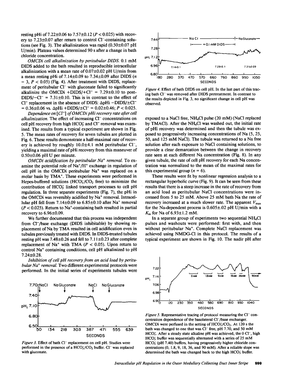 The collecting duct of the inner stripe outer medulla (OMCDi) is a major site of distal nephron acidification. Using the pH sensitive fluorescent dye 2'-7'-bis(carboxyethyl)-5,6,-carboxyfluorescein (BCECF) and quantitative spectrofluorometry to measure intracellular pH in isolated perfused OMCDi, we have characterized basolateral transport processes responsible for regulation of intracellular pH. Experiments suggesting the existence of basolateral Cl-/base exchange were performed. In HCO3- containing buffers, bath Cl- replacement resulted in reversible alkalinization of the OMCDi from 7.22 +/- 0.05 to 7.57 +/- 0.12. Similarly 0.1 mM bath 4',4'-diisothiocyanostilbene-2,2'-disulphonic acid (DIDS) alkalinized the OMCDi from 7.14 +/- 0.09 to 7.34 +/- 0.09 and blocked further alkalinization by bath Cl- removal (delta = + 0.02 pH units). The concentration dependence kinetics of Cl-/base exchange revealed a K1/2 of 10 mM for external Cl- with a Vmax of 0.50 pH U/min. Experiments suggesting the existence of basolateral Na+/H+ exchange were also performed. Replacement of bath Na+ by tetramethylammonium resulted in reversible cell acidification (7.14 +/- 0.09 to 6.85 +/- 0.1). Tubules that were acidified by a brief exposure to NH4Cl displayed recovery of cell pH back to baseline at a rate that was highly dependent on bath Na+ concentration. Half maximal recovery rate was achieved at 7 mM bath Na+ and Vmax was 0.605 pH U/min. The Na+-dependent rate of cell pH recovery after acidification was blocked by 0.2 mM bath amiloride. These results suggest that intracellular pH in the OMCDi is regulated by parallel basolateral Na+/H+ exchange and Cl-/base exchange.