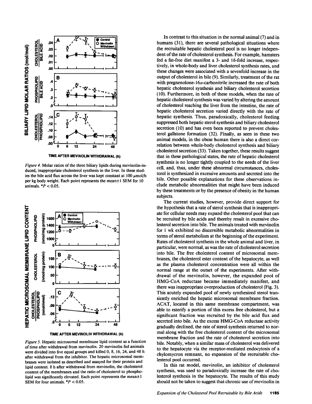 These studies test the hypothesis that a major determinant of excessive biliary cholesterol secretion is a level of hepatic sterol synthesis that is inappropriately high relative to the needs of the liver cell for preserving cholesterol balance. Biliary cholesterol secretion was measured in vivo in two models after loading the hepatocyte with sterol by two different mechanisms. In the first model, cholesterol was delivered physiologically to the liver in chylomicron remnants. This resulted in a sixfold increase in cholesteryl ester content and marked suppression of cholesterol synthesis, but biliary cholesterol secretion remained essentially constant. In the second model, 3-hydroxy-3-methyl-glutaryl CoA reductase levels in the liver were markedly increased by chronic mevinolin (lovastatin) administration. Withdrawal of the inhibitor resulted in a sudden fivefold increase in the rate of sterol synthesis in the liver of the experimental animals that was inappropriately high for cellular needs. This excessive synthesis, in turn, was accompanied by a fivefold increase in the cholesteryl ester content, enrichment of microsomal membranes with cholesterol and, most importantly, by a threefold increase in the rate of biliary sterol secretion. As the rate of sterol synthesis gradually returned to normal over 48 h, the cholesterol ester content, the lipid composition of the microsomal membranes, and rate of cholesterol secretion into bile also returned to baseline values. These results further support the concept of functional compartmentalization of cholesterol in the hepatocyte. Derangements that cause an inappropriately high rate of sterol synthesis in the endoplasmic reticulum may lead to an expansion of that pool of cholesterol that is recruitable by bile acids and, hence, to greater situation of the bile.