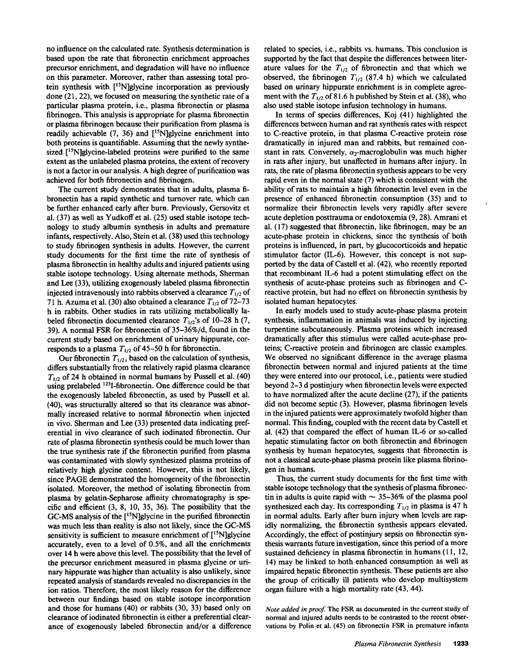 In humans, plasma fibronectin decreases early after operative injury, burn, or trauma, followed by a rapid restoration with a secondary decline typically observed if such patients become septic. We determined the rate of plasma fibronectin and plasma fibrinogen synthesis in normal subjects and injured patients using a stable isotope incorporation technique with [15N]glycine. During a constant 14-h infusion of [15N]glycine, the enrichment of [15N]glycine in both the free plasma glycine precursor pool as well as the urinary hippurate pool was determined; the latter used as an estimate of intracellular hepatic precursor enrichment. [15N]Glycine enrichment in both plasma fibronectin and fibrinogen was also quantified. The synthesis rate (Js/V) expressed in micrograms per milliliter of plasma per hour and the fractional synthesis rate (FSR) expressed as percentage of the plasma pool produced per day were determined. In normal subjects, the FSR for plasma fibronectin using 15N enrichment into urinary hippurate was 35.35 +/- 1.46%/d, whereas the Js/V was 4.45 +/- 0.19 micrograms/ml plasma per h. In normal subjects, the FSR for plasma fibronectin using 15N enrichment into free plasma glycine was 14.73 +/- 0.63%/d, whereas the Js/V was 1.98 +/- 0.09 micrograms/ml plasma per h. Early (2-3 d) after burn injury, fibronectin synthesis was increased (Js/V = 5.74 +/- 0.36; P less than 0.05), whereas later after injury, fibronectin synthesis began to decline (Js/V = 3.52 +/- 0.24; P less than 0.05) based on 15N enrichment of urinary hippurate. In contrast, the Js/V and FSR of plasma fibrinogen, a well-documented acute-phase plasma protein, revealed a sustained elevation (P less than 0.05) after injury in both the trauma and burn patients. Thus, plasma fibronectin synthesis is elevated early postinjury, which may contribute to the rapid restoration of its blood level. However, once fibronectin levels have normalized, the synthesis of plasma fibronectin appears to decline.