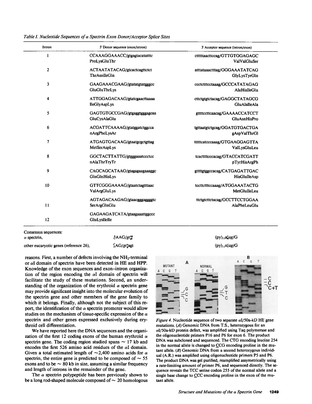 We have determined the exon-intron organization and the nucleotide sequence of the exons and their flanking intronic DNA in cloned genomic DNA that encodes the first 526 amino acids of the alpha I domain of the human red cell spectrin polypeptide chain. From the gene sequence we designed oligonucleotide primers to use in the polymerase chain reaction technique to amplify the appropriate exons in DNA from individuals with three variants of hereditary elliptocytosis characterized by the presence of abnormal alpha I spectrin peptides, 46-50 and 65-68 kD in size, in partial tryptic digests of spectrin. The alpha I/68-kD abnormality resulted from a duplication of leucine codon 148 in exon 4: TTG-CTG to TTG-TTG-CTG. The alpha I/50a defect was associated in different individuals with two separate single base changes in exon 6: CTG to CCG (leucine to proline) encoding residue 254, and TCC to CCC (serine to proline) encoding residue 255. In another individual with the alpha I/50a polypeptide defect, the nucleotide sequence encoding amino acid residues 221 through 264 was normal. The alpha I/50b abnormality resulted from a single base change of CAG (glutamine) to CCG (proline) encoding residue 465 in exon 11 in two unrelated individuals. In a third individual with alpha I/50b-kD hereditary elliptocytosis, the entire exon encoding residues 445 through 490 was normal. The relationship of the alpha I domain polypeptide structure to these mutations and the organization of the gene is discussed.