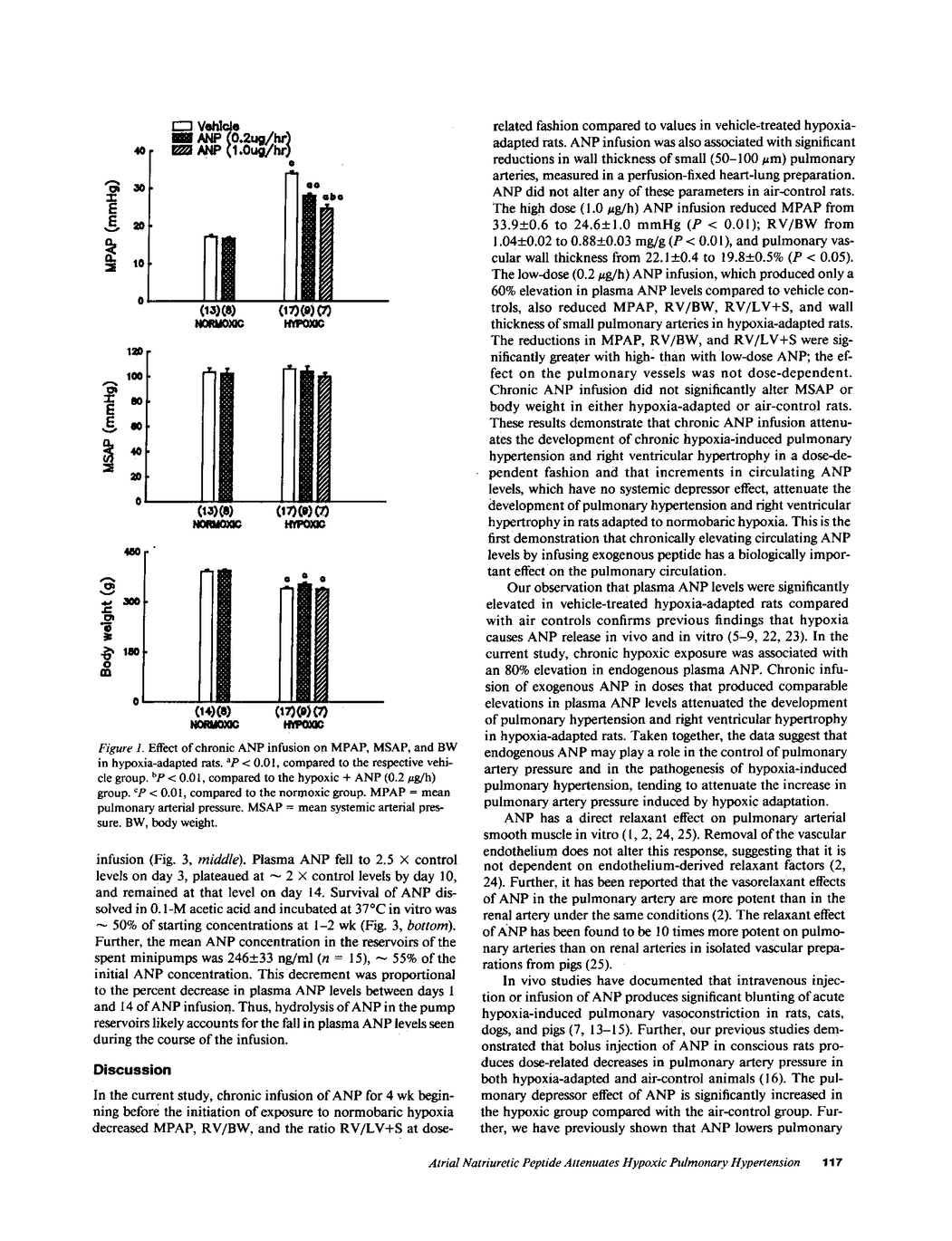 To test the hypothesis that chronic infusion of atrial natriuretic peptide (ANP) instituted before hypoxic exposure attenuates the development of pulmonary hypertension in hypoxia adapted rats, ANP (0.2 and 1.0 microgram/h) or vehicle was administered intravenously via osmotic minipump for 4 wk beginning before exposure to 10% O2 or to room air. Low dose ANP increased plasma ANP levels by only 60% of vehicle controls after 4 wk and significantly decreased mean pulmonary arterial pressure (MPAP) (P less than 0.01), the ratio of right ventricular weight to body weight (RV/BW) (P less than 0.01), and the wall thickness of small (50-100 microns) pulmonary arteries (P = 0.01) in hypoxia-adapted rats. ANP did not alter any of these parameters in air-control rats. High dose ANP increased plasma ANP levels by 230% of control and produced greater reductions in MPAP (P less than 0.001) and RV/BW) (P less than 0.05), but not in pulmonary arterial wall thickness, than the low dose. Neither dose of ANP altered mean systemic arterial pressure in either hypoxic or normoxic rats. The data demonstrate that chronic infusion of exogenous ANP at a dose that does not affect MPAP or RV weight in air-control rats attenuates the development of pulmonary hypertension and RV enlargement in rats adapted to chronic hypoxia.