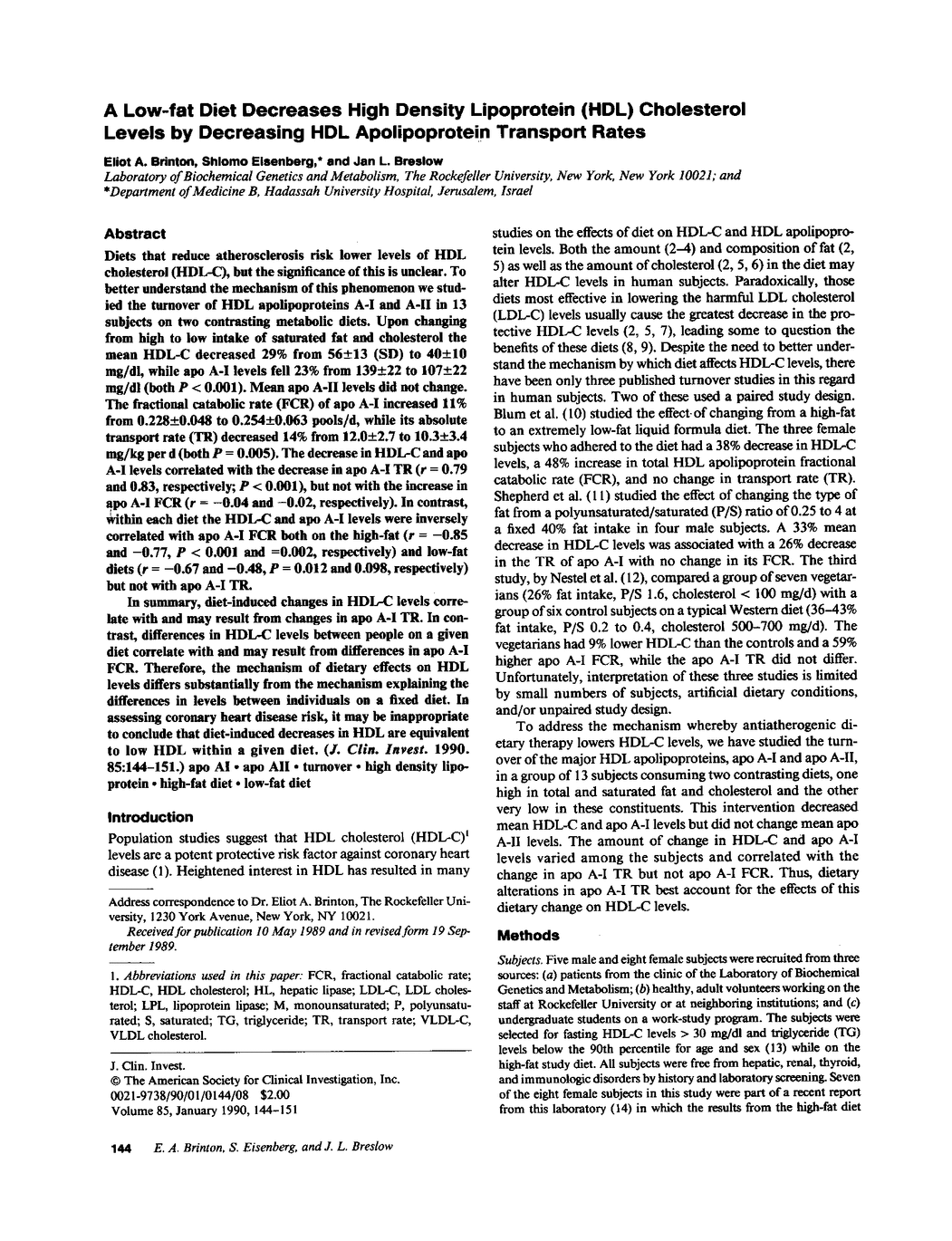 Diets that reduce atherosclerosis risk lower levels of HDL cholesterol (HDL-C), but the significance of this is unclear. To better understand the mechanism of this phenomenon we studied the turnover of HDL apolipoproteins A-I and A-II in 13 subjects on two contrasting metabolic diets. Upon changing from high to low intake of saturated fat and cholesterol the mean HDL-C decreased 29% from 56 +/- 13 (SD) to 40 +/- 10 mg/dl, while apo A-I levels fell 23% from 139 +/- 22 to 107 +/- 22 mg/dl (both P less than 0.001). Mean apo A-II levels did not change. The fractional catabolic rate (FCR) of apo A-I increased 11% from 0.228 +/- 0.048 to 0.254 +/- 0.063 pools/d, while its absolute transport rate (TR) decreased 14% from 12.0 +/- 2.7 to 10.3 +/- 3.4 mg/kg per d (both P = 0.005). The decrease in HDL-C and apo A-I levels correlated with the decrease in apo A-I TR (r = 0.79 and 0.83, respectively; P less than 0.001), but not with the increase in apo A-I FCR (r = -0.04 and -0.02, respectively). In contrast, within each diet the HDL-C and apo A-I levels were inversely correlated with apo A-I FCR both on the high-fat (r = -0.85 and -0.77, P less than 0.001 and = 0.002, respectively) and low-fat diets (r = -0.67 and -0.48, P = 0.012 and 0.098, respectively) but not with apo A-I TR. In summary, diet-induced changes in HDL-C levels correlate with and may result from changes in apo A-I TR. In contrast, differences in HDL-C levels between people on a given diet correlate with and may result from differences in apo A-I FCR. Therefore, the mechanism of dietary effects on HDL levels differs substantially from the mechanism explaining the differences in levels between individuals on a fixed diet. In assessing coronary heart disease risk, it may be inappropriate to conclude that diet-induced decreases in HDL are equivalent to low HDL within a given diet.