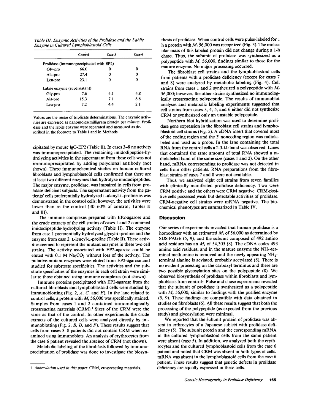 Cultured skin fibroblasts or lymphoblastoid cells from eight patients with clinical symptoms of prolidase deficiency were analyzed in terms of enzyme activity, presence of material crossreacting with specific antibodies, biosynthesis of the polypeptide, and mRNA corresponding to the enzyme. There are at least two enzymes that hydrolyze imidodipeptides in these cells and these two enzymes could be separated by an immunochemical procedure. The specific assay for prolidase showed that the enzyme activity was virtually absent in six cell strains and was markedly reduced in two (less than 3% of controls). The activities of the labile enzyme that did not immunoprecipitate with the anti-prolidase antibody were decreased in the cells (30-60% of controls). Cell strains with residual activities of prolidase had immunological polypeptides crossreacting with a Mr 56,000, similar to findings in the normal enzyme. The polypeptide biosynthesis in these cells and the controls was similar. Northern blot analyses revealed the presence of mRNA in the polypeptide-positive cells, yet it was absent in the polypeptide-negative cells. The substrate specificities analyzed in the partially purified enzymes from the polypeptide-positive cell strains differed, presumably due to different mutations. Thus, there seems to be a molecular heterogeneity in prolidase deficiency. There was no apparent relation between the clinical symptoms and the biochemical phenotypes, except that mental retardation was present in the polypeptide-negative patients. The activities of the labile enzyme may not be a major factor in modifying the clinical symptoms.