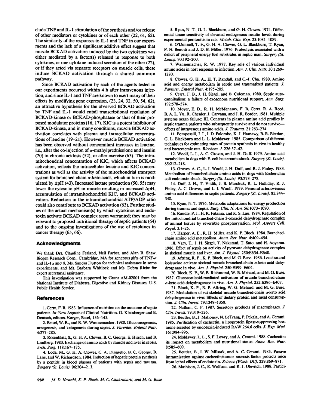 Protein catabolic states (i.e., sepsis and trauma) are thought to be associated with accelerated oxidation of branched-chain amino acids (BCAA). Branched-chain alpha-keto acid dehydrogenase (BCKAD), the rate-limiting enzyme for BCAA oxidation by muscle, is regulated by phosphorylation/dephosphorylation. Skeletal muscle BCKAD was only 2-4% active in control rats. Intravenous injection of Salmonella enteritidis endotoxin (0.25-10 mg/kg) did not change total BCKAD activity, but increased the percent active enzyme in muscle three- to four-fold in 4-6 h. Identical results were observed in adrenalectomized rats pretreated with one dose of alpha-methylprednisolone (2.5 mg/kg i.p.) 30-60 min before saline or endotoxin injection, indicating that endotoxin's effect was not mediated by hypersecretion of adrenal hormones. Cortisone pretreatment of normal rats (100 mg/kg per d) for 2 d prevented endotoxin-induced activation of muscle BCKAD, suggesting that endogenous secretion products mediated BCKAD activation by endotoxin. Human recombinant tumor necrosis factor-alpha and/or IL-1 beta or alpha (50 micrograms/kg) increased muscle BCKAD activation two- to fourfold in normal rats 4-6 h after intravenous injection. We conclude that cytokine-mediated activation of muscle BCKAD may contribute to accelerated BCAA oxidation in septicemia.