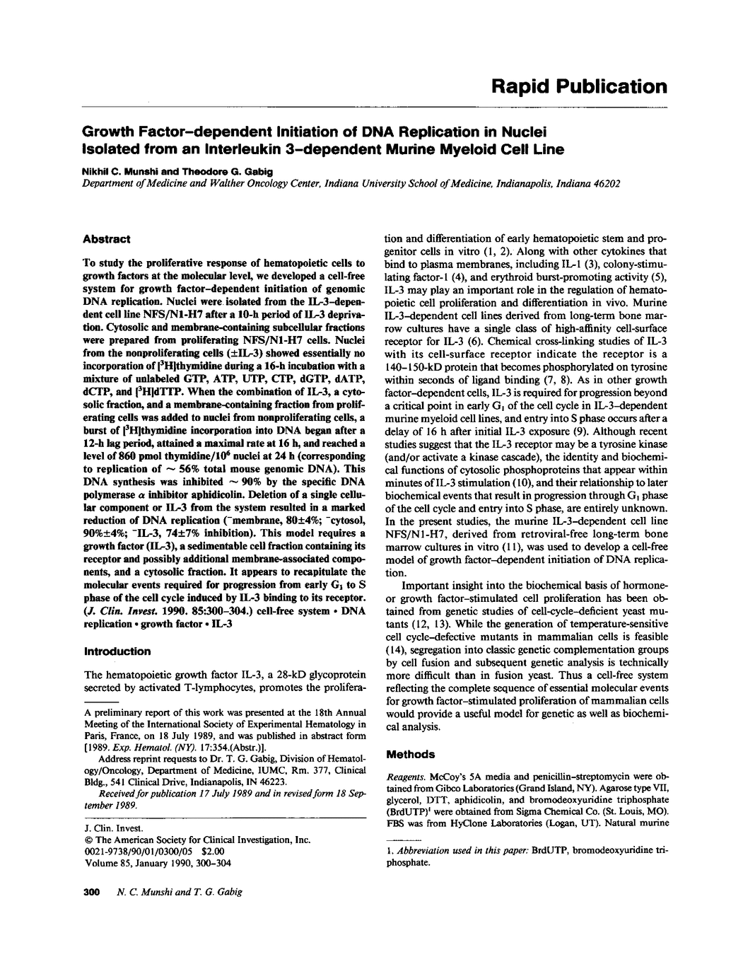 To study the proliferative response of hematopoietic cells to growth factors at the molecular level, we developed a cell-free system for growth factor-dependent initiation of genomic DNA replication. Nuclei were isolated from the IL-3-dependent cell line NFS/N1-H7 after a 10-h period of IL-3 deprivation. Cytosolic and membrane-containing subcellular fractions were prepared from proliferating NFS/N1-H7 cells. Nuclei from the nonproliferating cells (+/- IL-3) showed essentially no incorporation of [3H]thymidine during a 16-h incubation with a mixture of unlabeled GTP, ATP, UTP, CTP, dGTP, dATP, dCTP, and [3H]dTTP. When the combination of IL-3, a cytosolic fraction, and a membrane-containing fraction from proliferating cells was added to nuclei from nonproliferating cells, a burst of [3H]thymidine incorporation into DNA began after a 12-h lag period, attained a maximal rate at 16 h, and reached a level of 860 pmol thymidine/10(6) nuclei at 24 h (corresponding to replication of approximately 56% total mouse genomic DNA). This DNA synthesis was inhibited approximately 90% by the specific DNA polymerase alpha inhibitor aphidicolin. Deletion of a single cellular component or IL-3 from the system resulted in a marked reduction of DNA replication (-membrane, 80 +/- 4%; -cytosol, 90% +/- 4%; -IL-3, 74 +/- 7% inhibition). This model requires a growth factor (IL-3), a sedimentable cell fraction containing its receptor and possibly additional membrane-associated components, and a cytosolic fraction. It appears to recapitulate the molecular events required for progression from early G1 to S phase of the cell cycle induced by IL-3 binding to its receptor.