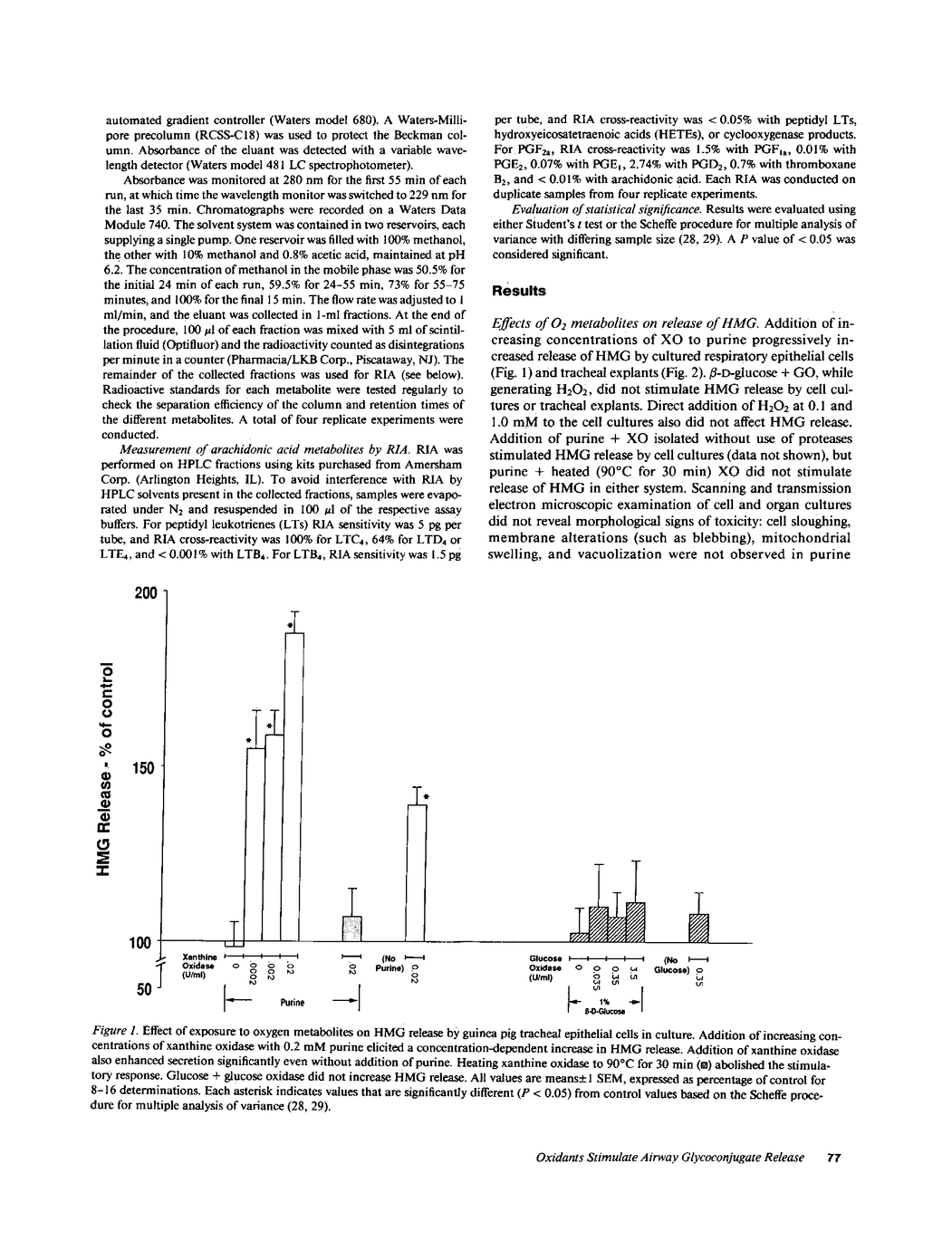Several common pulmonary disorders characterized by mucus hypersecretion and airway obstruction may relate to increased levels of inhaled or endogenously generated oxidants (O2 metabolites) in the respiratory tract. We found that O2 metabolites stimulated release of high-molecular-weight glycoconjugates (HMG) by respiratory epithelial cells in vitro through a mechanism involving cyclooxygenase metabolism of arachidonic acid. Noncytolytic concentrations of chemically generated O2 metabolites (purine + xanthine oxidase) stimulated HMG release by cell and explant cultures of rodent airway epithelium, an effect which is inhibitable by coaddition of specific O2 metabolite scavengers or inhibitors of arachidonic acid metabolism. Addition of O2 metabolites to epithelial cells provoked production of PGF2a, an effect also inhibitable by coaddition of O2 metabolite scavengers or inhibitors of arachidonic acid metabolism. Finally, addition of exogenous PGF2a to cell cultures stimulated HMG release. We conclude that O2 metabolites increase release of respiratory HMG through a mechanism involving cyclooxygenase metabolism of arachidonic acid with production mainly of PGF2a. This mechanism may be fundamental to the pathogenesis of a variety of lung diseases associated with hypersecretion of mucus and/or other epithelial fluids, as well as a basic cellular response to increased oxidants.