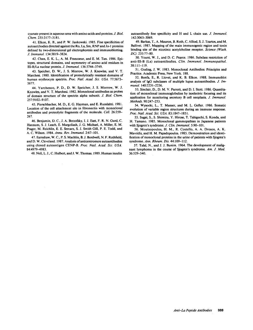 Autoantibodies to a polymerase III transcription factor, La (SS-B), are frequently detected in the serum of patients with Sjogren's syndrome and systemic lupus erythematosus. To define the humoral immune response to this protein, we analyzed the patterns of antibody recognition toward 13 recombinant La peptides by immunoblotting and determined the heterogeneity of antibodies reactive with the immunodominant epitopes. The smallest epitopes that were strongly antigenic and recognized by greater than 70% of sera tested (immunodominant) were encoded by the subclones BgX and XA located in the 5' and 3' halves of the La cDNA, respectively. Conformation of the immunodominant La peptides played a major role in antibody recognition. Although greater diversity in antibody binding to carboxyl-terminal La peptides was observed, the overall pattern of peptide recognition by anti-La antibodies was similar in different diseases. The antibody responses to the immunodominant peptides were strongly correlated (r = 0.68, P less than 0.001). One- and two-dimensional isoelectric focusing of affinity purified IgG anti-La peptide antibodies revealed restricted heterogeneity and oligoclonal bands (kappa light chains). These observations suggest that anti-La antibodies are induced and/or maintained by the self antigen and that their diversity is constrained either by mechanisms related to tolerance or by affinity maturation of the humoral immune response.