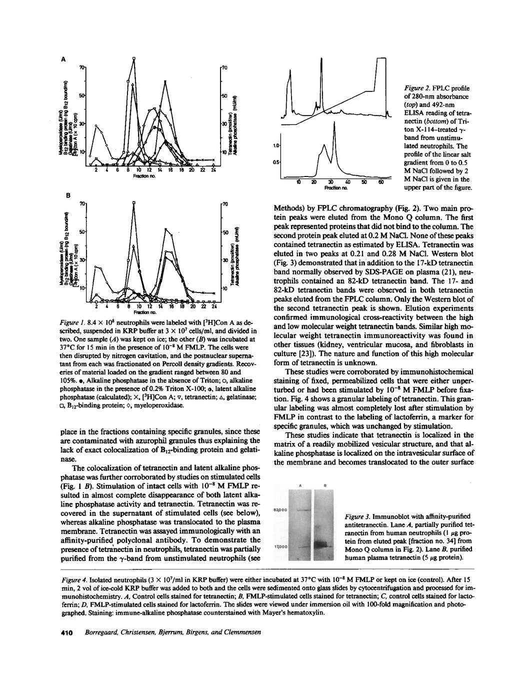Tetranectin, a protein recently identified in a wide variety of human secretory cells (Christensen, L., and I. Clemmensen. 1989. Histochemistry. 92:29-35) was found to colocalize with latent alkaline phosphatase activity in fractions well separated from azurophil granules, specific granules, gelatinase-containing granules, and plasma membranes when postnuclear supernatants of nitrogen-cavitated neutrophils were fractionated on discontinuous Percoll density gradients. Stimulation of intact neutrophils with nanomolar concentrations of FMLP, leukotriene B4, 10-100 U/ml of tumor necrosis factor, and granulocyte-macrophage colony-stimulating factor resulted in parallel release of tetranectin and translocation of alkaline phosphatase to the plasma membrane. Furthermore, intracellular pools of tetranectin and latent alkaline phosphatase were completely released from neutrophils under conditions that barely induced release of specific granules containing B12-binding protein. These findings indicate that tetranectin and latent alkaline phosphatase define an easily mobilizable population of cytoplasmic storage organelles in human neutrophils which are functionally distinguishable from azurophil, specific, and gelatinase-containing granules. These organelles may play an important role as stores of membrane proteins that are mobilized to the cell surface during stimulation by inflammatory mediators.