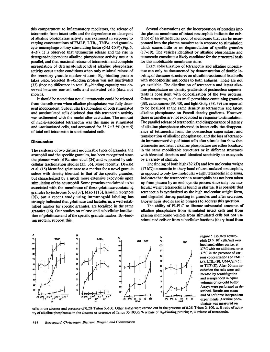 Tetranectin, a protein recently identified in a wide variety of human secretory cells (Christensen, L., and I. Clemmensen. 1989. Histochemistry. 92:29-35) was found to colocalize with latent alkaline phosphatase activity in fractions well separated from azurophil granules, specific granules, gelatinase-containing granules, and plasma membranes when postnuclear supernatants of nitrogen-cavitated neutrophils were fractionated on discontinuous Percoll density gradients. Stimulation of intact neutrophils with nanomolar concentrations of FMLP, leukotriene B4, 10-100 U/ml of tumor necrosis factor, and granulocyte-macrophage colony-stimulating factor resulted in parallel release of tetranectin and translocation of alkaline phosphatase to the plasma membrane. Furthermore, intracellular pools of tetranectin and latent alkaline phosphatase were completely released from neutrophils under conditions that barely induced release of specific granules containing B12-binding protein. These findings indicate that tetranectin and latent alkaline phosphatase define an easily mobilizable population of cytoplasmic storage organelles in human neutrophils which are functionally distinguishable from azurophil, specific, and gelatinase-containing granules. These organelles may play an important role as stores of membrane proteins that are mobilized to the cell surface during stimulation by inflammatory mediators.