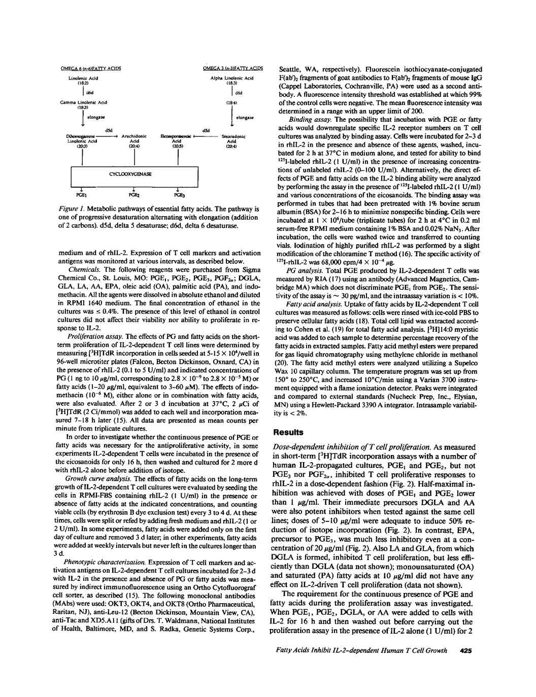 PGE represent oxygenation products of polyunsaturated essential fatty acids and are important regulators of cell-mediated immune responses. Because oils enriched in such fatty acids reduce inflammation and tissue injury in vivo, we examined the effects of these PGE precursors on IL-2-driven growth of human T lymphocytes. Dihomogamma linoleic acid (DGLA), AA, and their metabolites (PGE1 and PGE2, respectively) strongly inhibited short- and long-term growth of IL-2-dependent T cell cultures; EPA was much less inhibitory and its product, PGE3, failed to suppress IL-2 responses. Short-term pretreatment of the cells with DGLA or AA and removal of the fatty acids before the proliferation assay resulted in a smaller reduction in [3H]TdR incorporation. PGE and fatty acids did not alter the number of high affinity IL-2 binding sites on the T cell cultures but reduced the percentage of cells expressing CD25 and HLA class II molecules. No PGE was detected in supernatants from the fatty acid-treated cultures. Moreover, indomethacin, a cyclooxygenase inhibitor, did not reverse the antiproliferative effects of the fatty acids. Together, these findings indicate that fatty acids can inhibit IL-2-driven T cell growth via a PGE-independent mechanism and might be relevant to inflammatory diseases associated with persistent T cell activation.