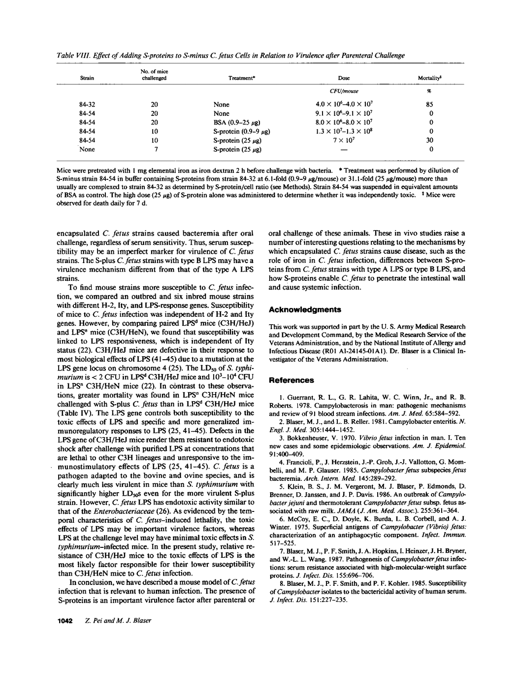 We developed a mouse model to compare the virulence of Campylobacter fetus strains with (S-plus) and without (S-minus) surface array protein (S-protein) capsules. In adult HA/ICR mice pretreated with ferric chloride, the LD50 for S-plus strain 84-32 was 43.3 times lower than its spontaneous S-minus mutant 84-54. Seven strains of inbred mice were no more susceptible than the outbred strain. In contrast to the findings with Salmonella typhimurium by others, 3 X 10(7) CFU of strain 84-32 caused 90% mortality in C3H/HeN (LPSn) mice and 40% mortality in C3H/HeJ (LPSd) mice. High-grade bacteremia in HA/ICR mice occurred after oral challenge with S-plus C. fetus strains and continued for at least 2 d, but was not present in any mice challenged with S-minus strains. Bacteremia at 30 min after challenge was 51.6-fold lower in mice pretreated with 10 microliters of rabbit antiserum to purified S-protein than after pretreatment with normal rabbit serum. Challenge of mice with a mixture of S-minus strain 84-54 and free S-proteins at a concentration 31.1-fold higher than found in wild-type strain 84-32 caused 30% mortality, compared with 0% with strain 84-54 or S-protein alone. These findings in a mouse model point toward the central role of the S-protein in the pathogenesis of C. fetus infection. The S-protein is not toxic per se, but enhances virulence when present on the bacterial cell surface as a capsule.