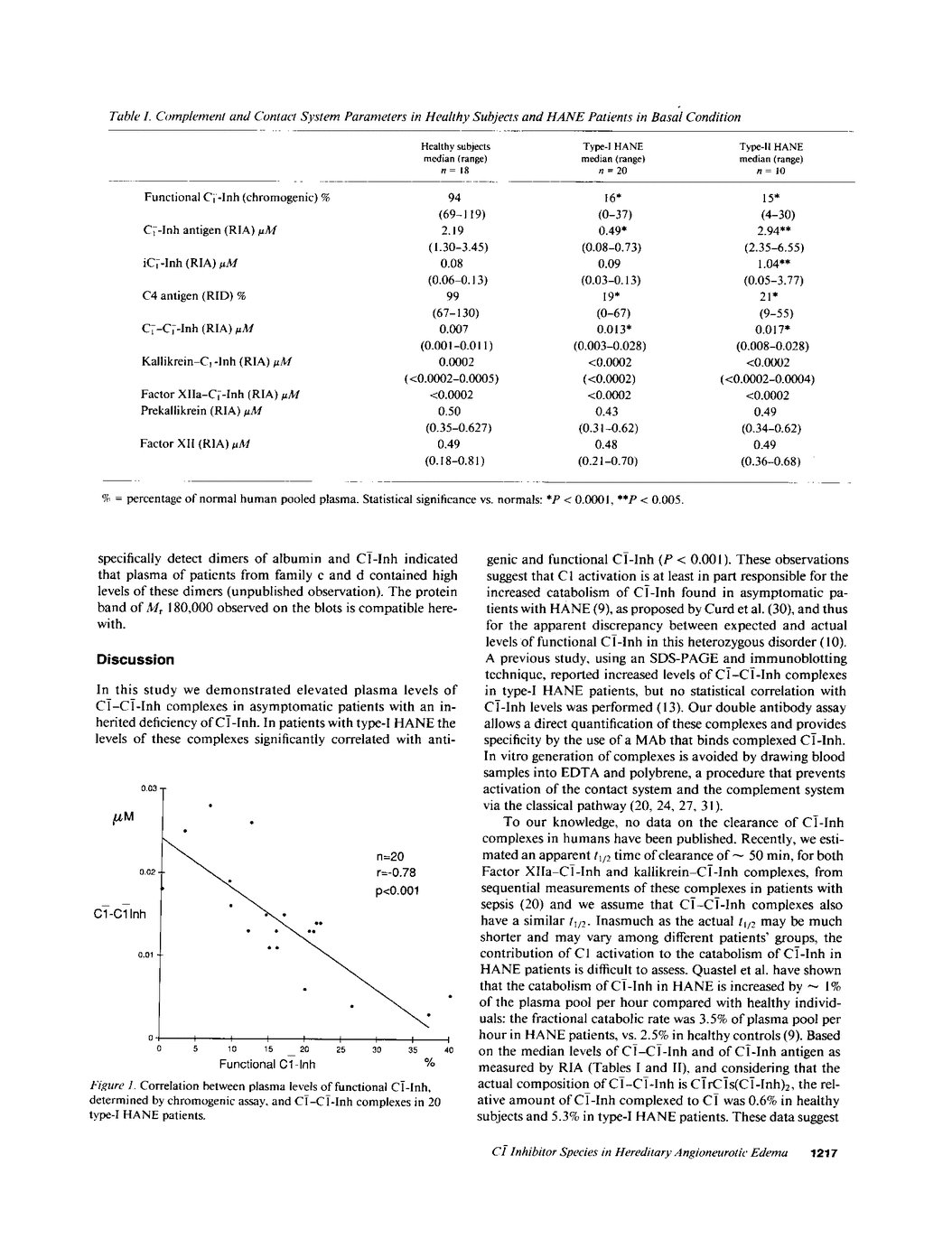 C1- inhibitor (C1(-)-Inh) catabolism in plasma of patients with hereditary angioneurotic edema (HANE) was assessed by measuring the complexes formed by C1(-)-Inh with its target proteases (C1-s, Factor XIIa, and kallikrein) and a modified (cleaved) inactive form of C1(-)-Inh (iC1(-)-Inh). This study was performed in plasma from 18 healthy subjects and 30 patients with HANE in remission: 20 with low antigen concentration (type I) and 10 (from 5 different kindreds) with dysfunctional protein (type II). Both type-I and type-II patients had increased C1(-)-C1(-)-Inh complexes (P less than 0.0001), which in type I inversely correlated with the levels of C1(-)-Inh (P less than 0.001). iC1(-)-Inh was normal in all type-I patients and in type-II patients from three families with increased C1(-)-Inh antigen, whereas iC1(-)-Inh was higher than 20 times the normal values in patients from the remaining two families with C1(-)-Inh antigen in the normal range. None of the subjects had an increase of either Factor XIIa-C1(-)-Inh or kallikrein-C1(-)-Inh complexes. This study shows that the hypercatabolism of C1(-)-Inh in HANE patients at least in part occurs via the formation of complexes with C1- and that genetically determined differences in catabolism of dysfunctional C1(-)-Inh proteins are present in type-II patients.