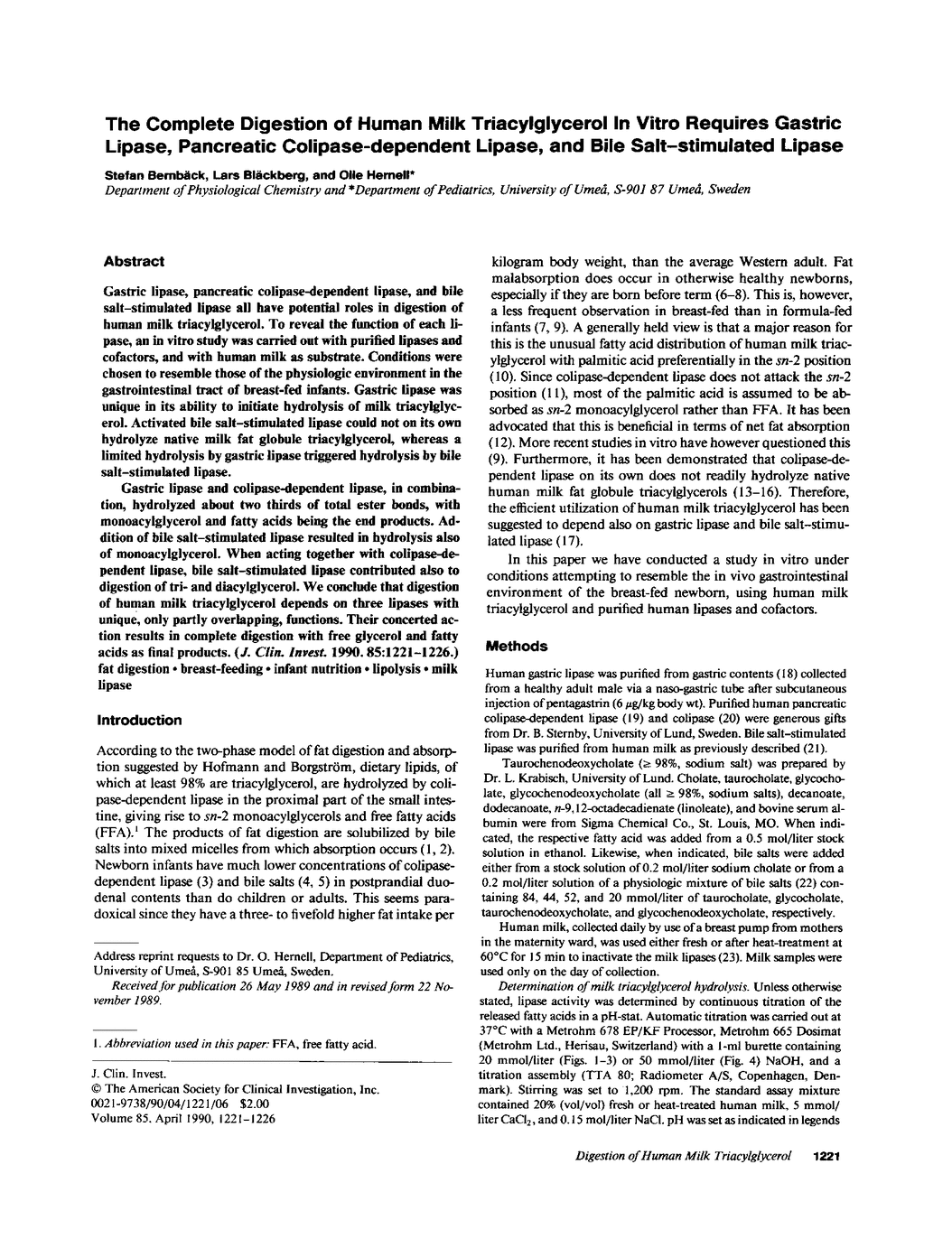 Gastric lipase, pancreatic colipase-dependent lipase, and bile salt-stimulated lipase all have potential roles in digestion of human milk triacylglycerol. To reveal the function of each lipase, an in vitro study was carried out with purified lipases and cofactors, and with human milk as substrate. Conditions were chosen to resemble those of the physiologic environment in the gastrointestinal tract of breast-fed infants. Gastric lipase was unique in its ability to initiate hydrolysis of milk triacylglycerol. Activated bile salt-stimulated lipase could not on its own hydrolyze native milk fat globule triacylglycerol, whereas a limited hydrolysis by gastric lipase triggered hydrolysis by bile salt-stimulated lipase. Gastric lipase and colipase-dependent lipase, in combination, hydrolyzed about two thirds of total ester bonds, with monoacylglycerol and fatty acids being the end products. Addition of bile salt-stimulated lipase resulted in hydrolysis also of monoacylglycerol. When acting together with colipase-dependent lipase, bile salt-stimulated lipase contributed also to digestion of tri- and diacylglycerol. We conclude that digestion of human milk triacylglycerol depends on three lipases with unique, only partly overlapping, functions. Their concerted action results in complete digestion with free glycerol and fatty acids as final products.