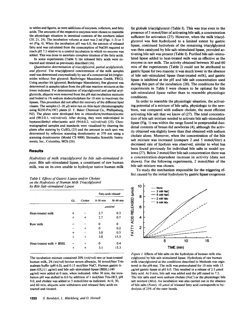 Gastric lipase, pancreatic colipase-dependent lipase, and bile salt-stimulated lipase all have potential roles in digestion of human milk triacylglycerol. To reveal the function of each lipase, an in vitro study was carried out with purified lipases and cofactors, and with human milk as substrate. Conditions were chosen to resemble those of the physiologic environment in the gastrointestinal tract of breast-fed infants. Gastric lipase was unique in its ability to initiate hydrolysis of milk triacylglycerol. Activated bile salt-stimulated lipase could not on its own hydrolyze native milk fat globule triacylglycerol, whereas a limited hydrolysis by gastric lipase triggered hydrolysis by bile salt-stimulated lipase. Gastric lipase and colipase-dependent lipase, in combination, hydrolyzed about two thirds of total ester bonds, with monoacylglycerol and fatty acids being the end products. Addition of bile salt-stimulated lipase resulted in hydrolysis also of monoacylglycerol. When acting together with colipase-dependent lipase, bile salt-stimulated lipase contributed also to digestion of tri- and diacylglycerol. We conclude that digestion of human milk triacylglycerol depends on three lipases with unique, only partly overlapping, functions. Their concerted action results in complete digestion with free glycerol and fatty acids as final products.