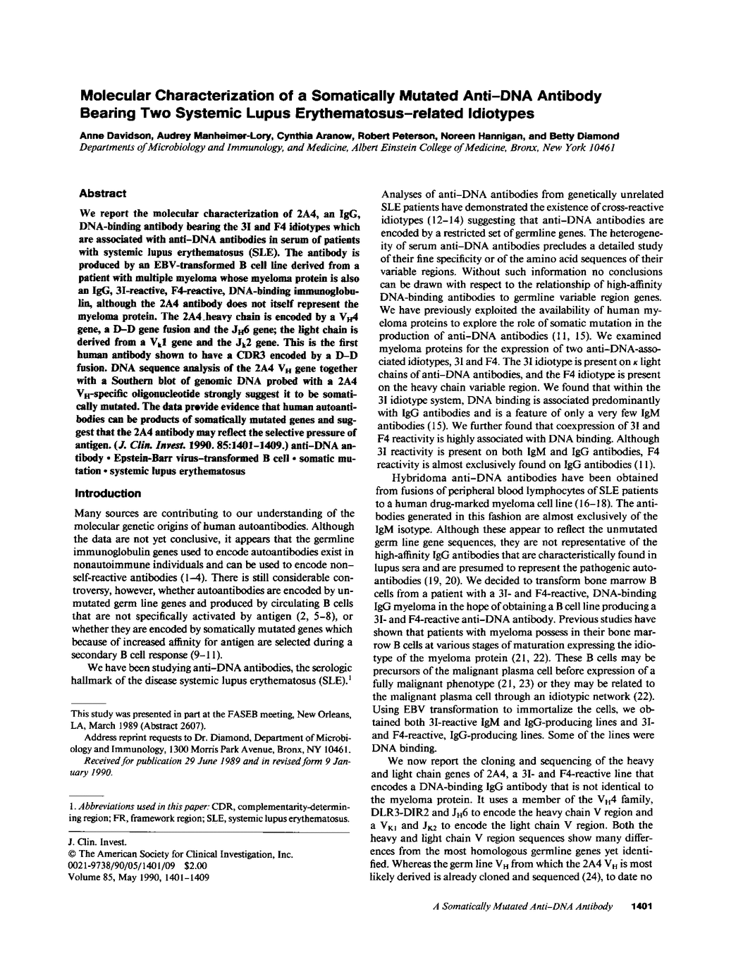 We report the molecular characterization of 2A4, an IgG, DNA-binding antibody bearing the 3I and F4 idiotypes which are associated with anti-DNA antibodies in serum of patients with systemic lupus erythematosus (SLE). The antibody is produced by an EBV-transformed B cell line derived from a patient with multiple myeloma whose myeloma protein is also an IgG, 3I-reactive, F4-reactive, DNA-binding immunoglobulin, although the 2A4 antibody does not itself represent the myeloma protein. The 2A4 heavy chain is encoded by a VH4 gene, a D-D gene fusion and the JH6 gene; the light chain is derived from a Vk1 gene and the Jk2 gene. This is the first human antibody shown to have a CDR3 encoded by a D-D fusion. DNA sequence analysis of the 2A4 VH gene together with a Southern blot of genomic DNA probed with a 2A4 VH-specific oligonucleotide strongly suggest it to be somatically mutated. The data provide evidence that human autoantibodies can be products of somatically mutated genes and suggest that the 2A4 antibody may reflect the selective pressure of antigen.