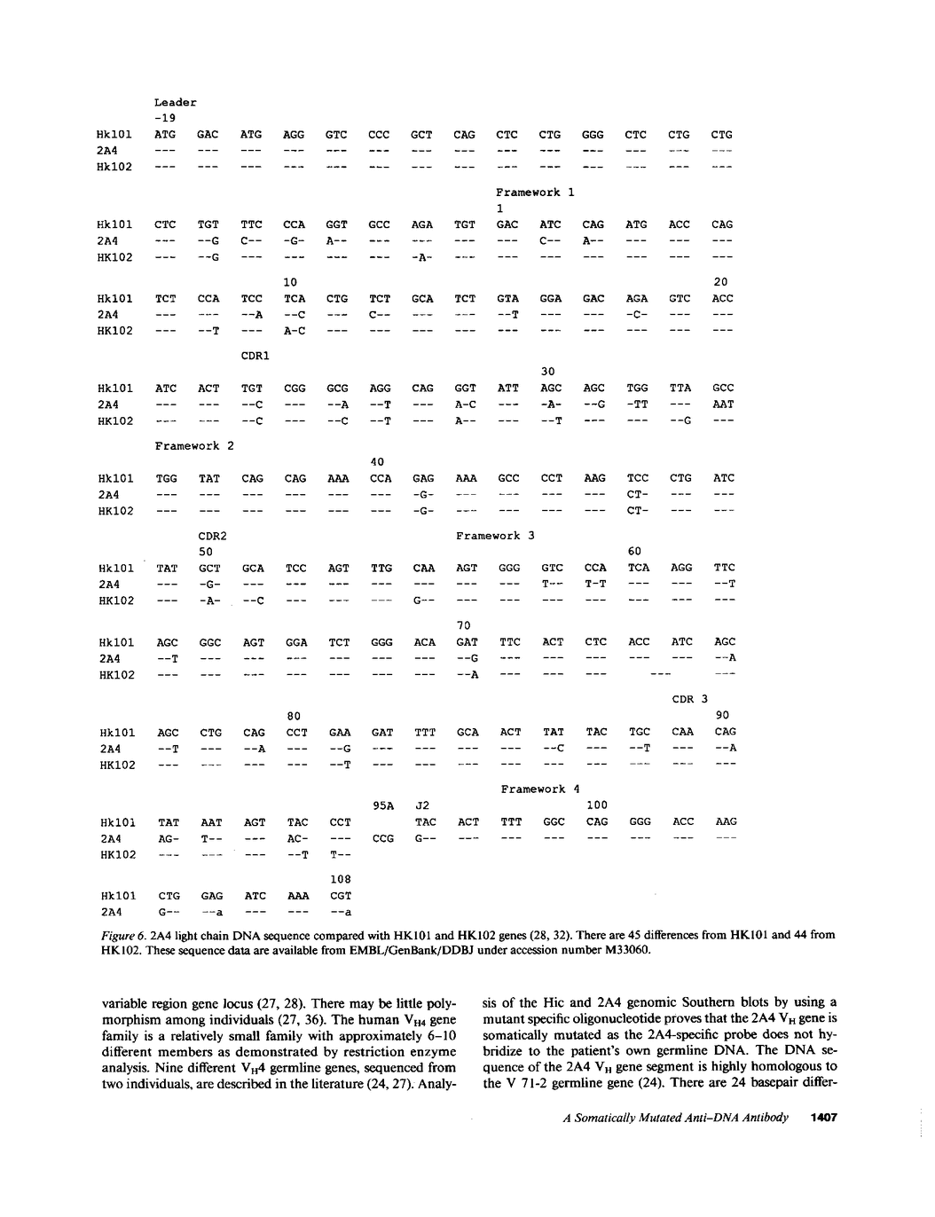 We report the molecular characterization of 2A4, an IgG, DNA-binding antibody bearing the 3I and F4 idiotypes which are associated with anti-DNA antibodies in serum of patients with systemic lupus erythematosus (SLE). The antibody is produced by an EBV-transformed B cell line derived from a patient with multiple myeloma whose myeloma protein is also an IgG, 3I-reactive, F4-reactive, DNA-binding immunoglobulin, although the 2A4 antibody does not itself represent the myeloma protein. The 2A4 heavy chain is encoded by a VH4 gene, a D-D gene fusion and the JH6 gene; the light chain is derived from a Vk1 gene and the Jk2 gene. This is the first human antibody shown to have a CDR3 encoded by a D-D fusion. DNA sequence analysis of the 2A4 VH gene together with a Southern blot of genomic DNA probed with a 2A4 VH-specific oligonucleotide strongly suggest it to be somatically mutated. The data provide evidence that human autoantibodies can be products of somatically mutated genes and suggest that the 2A4 antibody may reflect the selective pressure of antigen.