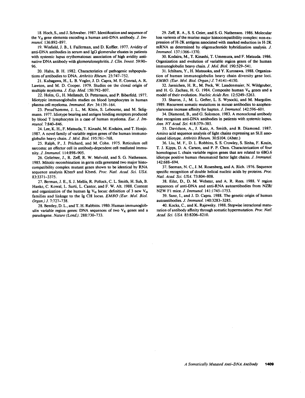 We report the molecular characterization of 2A4, an IgG, DNA-binding antibody bearing the 3I and F4 idiotypes which are associated with anti-DNA antibodies in serum of patients with systemic lupus erythematosus (SLE). The antibody is produced by an EBV-transformed B cell line derived from a patient with multiple myeloma whose myeloma protein is also an IgG, 3I-reactive, F4-reactive, DNA-binding immunoglobulin, although the 2A4 antibody does not itself represent the myeloma protein. The 2A4 heavy chain is encoded by a VH4 gene, a D-D gene fusion and the JH6 gene; the light chain is derived from a Vk1 gene and the Jk2 gene. This is the first human antibody shown to have a CDR3 encoded by a D-D fusion. DNA sequence analysis of the 2A4 VH gene together with a Southern blot of genomic DNA probed with a 2A4 VH-specific oligonucleotide strongly suggest it to be somatically mutated. The data provide evidence that human autoantibodies can be products of somatically mutated genes and suggest that the 2A4 antibody may reflect the selective pressure of antigen.