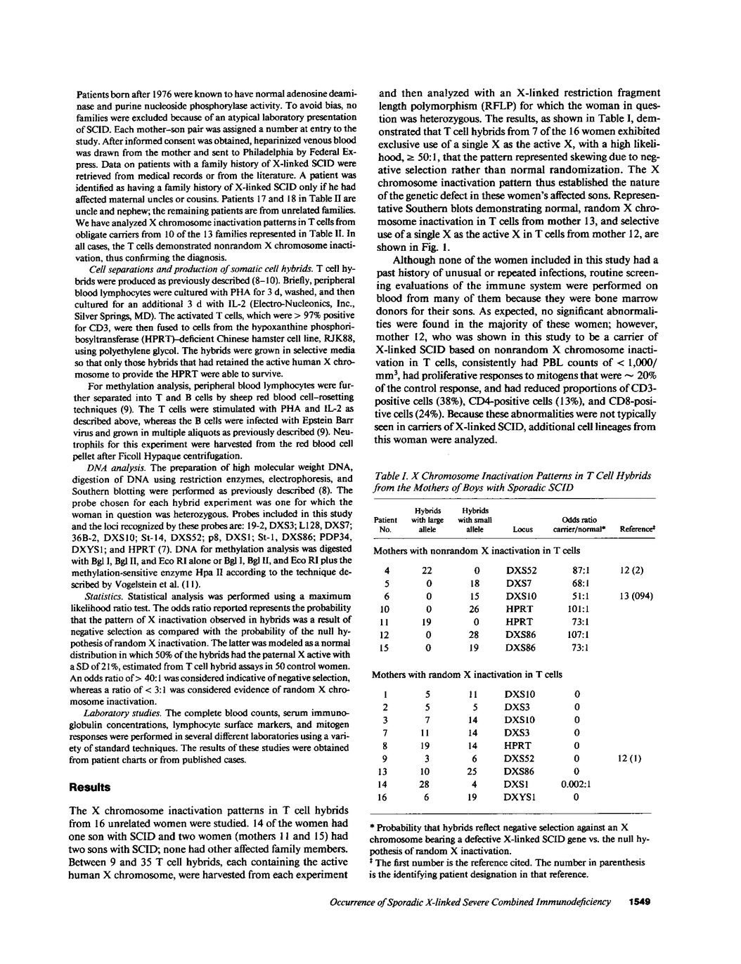 Over 80% of infants with severe combined immunodeficiency (SCID) of unknown genetic etiology are males, yet less than a third of these affected males have a family history of X-linked disease. To help identify new mutations of the X-linked SCID gene and to provide genetic counseling, X chromosome inactivation patterns in T cells from 16 women who had sons with sporadic SCID were examined. Between 9 and 35 human/hamster hybrids that selectively retained the active human X chromosome were produced from the T cells of each woman and analyzed with an X-linked restriction fragment length polymorphism for which the woman in question was heterozygous. Exclusive use of a single X as the active X was seen in the T cell hybrids from 7 of the 16 women, identifying these women as carriers of X-linked SCID. Studies on additional family members confirmed the mutant nature of the inactive X and revealed the source of the new mutation in three families. To determine whether there were any laboratory characteristics that might differentiate the boys whose mothers were identified as carriers of X-linked SCID from those whose mothers were not, the clinical records of both groups were compared to each other and to a group of 14 boys with a family history of X-linked SCID. The most consistent finding in the 21 patients with X-linked SCID was an elevated proportion of B cells. These data demonstrate the high incidence of spontaneous mutation for the X-linked SCID gene and help clarify the characteristic presenting features of this disorder.