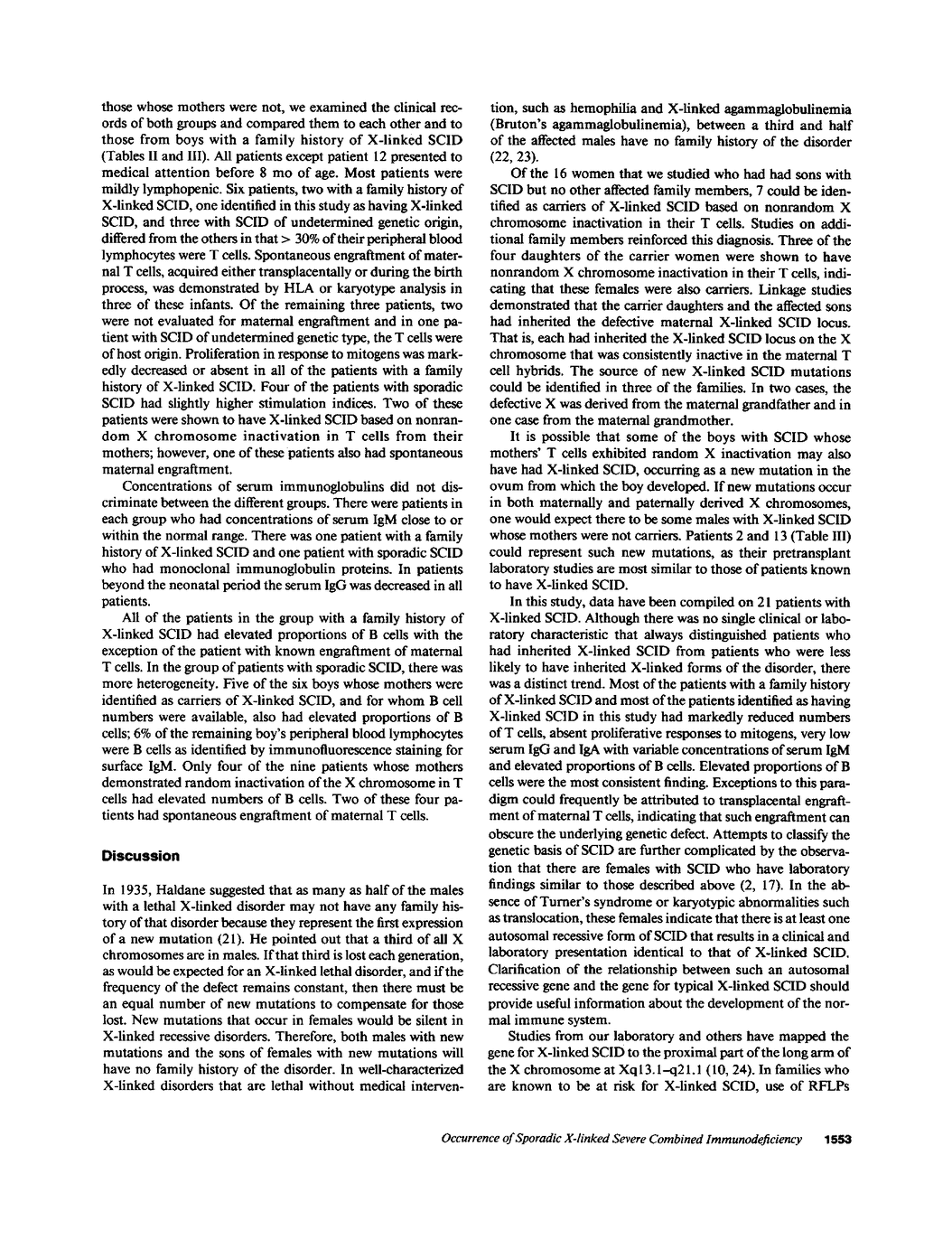 Over 80% of infants with severe combined immunodeficiency (SCID) of unknown genetic etiology are males, yet less than a third of these affected males have a family history of X-linked disease. To help identify new mutations of the X-linked SCID gene and to provide genetic counseling, X chromosome inactivation patterns in T cells from 16 women who had sons with sporadic SCID were examined. Between 9 and 35 human/hamster hybrids that selectively retained the active human X chromosome were produced from the T cells of each woman and analyzed with an X-linked restriction fragment length polymorphism for which the woman in question was heterozygous. Exclusive use of a single X as the active X was seen in the T cell hybrids from 7 of the 16 women, identifying these women as carriers of X-linked SCID. Studies on additional family members confirmed the mutant nature of the inactive X and revealed the source of the new mutation in three families. To determine whether there were any laboratory characteristics that might differentiate the boys whose mothers were identified as carriers of X-linked SCID from those whose mothers were not, the clinical records of both groups were compared to each other and to a group of 14 boys with a family history of X-linked SCID. The most consistent finding in the 21 patients with X-linked SCID was an elevated proportion of B cells. These data demonstrate the high incidence of spontaneous mutation for the X-linked SCID gene and help clarify the characteristic presenting features of this disorder.