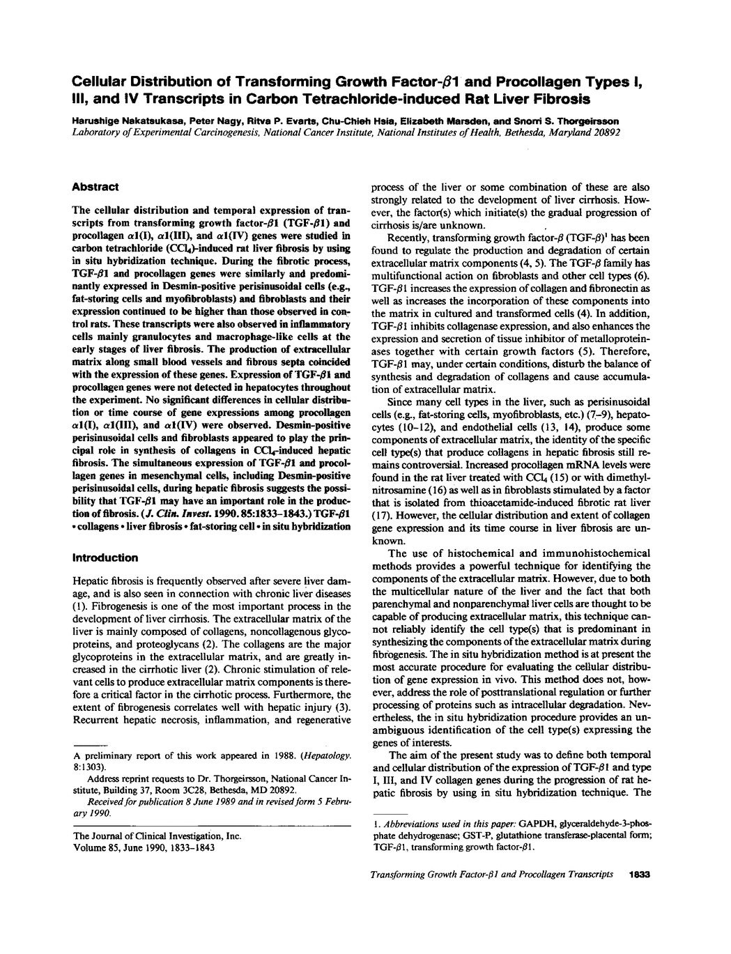 The cellular distribution and temporal expression of transcripts from transforming growth factor-beta 1 (TGF-beta 1) and procollagen alpha 1(I), alpha 1(III), and alpha 1(IV) genes were studied in carbon tetrachloride (CCl4)-induced rat liver fibrosis by using in situ hybridization technique. During the fibrotic process, TGF-beta 1 and procollagen genes were similarly and predominantly expressed in Desmin-positive perisinusoidal cells (e.g., fat-storing cells and myofibroblasts) and fibroblasts and their expression continued to be higher than those observed in control rats. These transcripts were also observed in inflammatory cells mainly granulocytes and macrophage-like cells at the early stages of liver fibrosis. The production of extracellular matrix along small blood vessels and fibrous septa coincided with the expression of these genes. Expression of TGF-beta 1 and procollagen genes were not detected in hepatocytes throughout the experiment. No significant differences in cellular distribution or time course of gene expression among procollagen alpha 1(I), alpha 1(III), and alpha 1(IV) were observed. Desmin-positive perisinusoidal cells and fibroblasts appeared to play the principal role in synthesis of collagens in CCl4-induced hepatic fibrosis. The simultaneous expression of TGF-beta 1 and procollagen genes in mesenchymal cells, including Desmin-positive perisinusoidal cells, during hepatic fibrosis suggests the possibility that TGF-beta 1 may have an important role in the production of fibrosis.