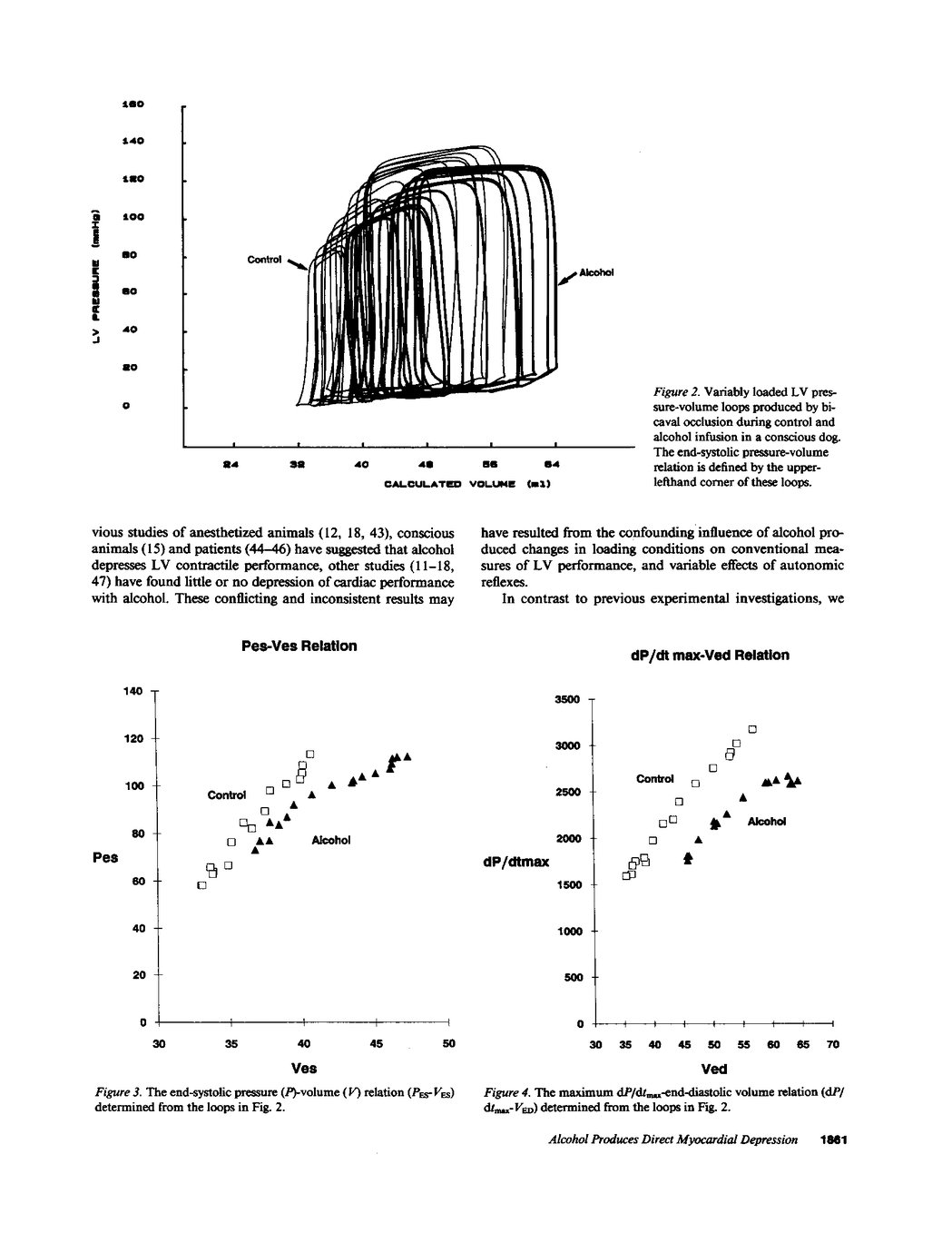 We assessed the effect of alcohol, before and after autonomic blockade, on left ventricular (LV) performance in conscious dogs. 10 animals were instrumented to determine LV volume from ultrasonic LV internal dimensions and measure LV pressure with a micromanometer. The animals were studied in the conscious state after full recovery from the operation. Blood alcohol was undetectable before and 67 +/- 14 mg/dl (mean +/- SD) at 20 min after alcohol administration. In response to alcohol, the LV systolic pressure was reduced slightly, the left ventricular end-diastolic pressure increased slightly. The maximum time derivative of LV pressure (dP/dtmax) and stroke volume were decreased. The end-systolic volume (VES), as well as effective arterial elastance, were significantly increased. There was no significant change in heart rate. Variably loaded pressure-volume loops were generated by acute caval occlusion before, immediately, and 20 min after the intravenous infusion of alcohol (0.2 g/kg). Three measures of LV performance were derived from these variably loaded pressure-volume loops: the end-systolic pressure-volume relation; the stroke work-end-diastolic volume relation; and maximum dP/dt-VED relation. The slopes of all three relations were significantly decreased in response to alcohol, and all three relations were shifted toward the right, indicating a depression of LV contractile performance. Similar, but greater depressions of LV performance with alcohol were observed following autonomic blockade. LV performance was restored by infusing dobutamine. We conclude that mildly intoxicating levels of alcohol (blood concentration less than 100 mg/dl) are capable of producing LV contractile depression in conscious animals, which is more marked after autonomic blockade. This suggests that patients with impaired LV function should avoid even small amounts of alcohol.