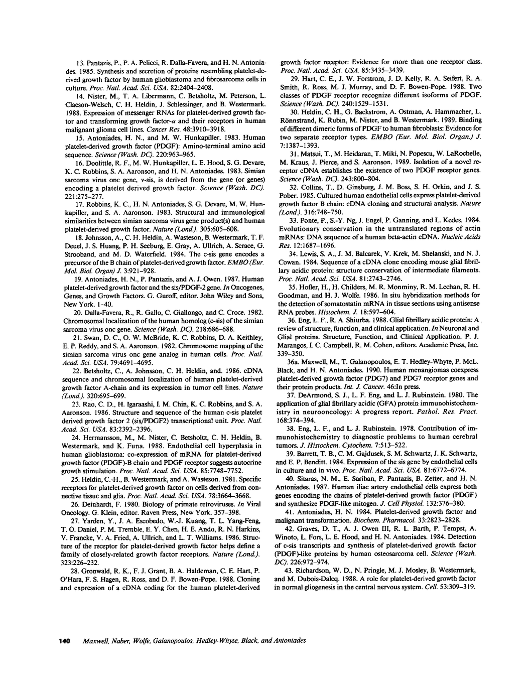 The present studies investigated the expression of the two PDGF genes (c-sis/PDGF-2 and PDGF-1) and the PDGF-receptor b gene (PDGF-R) in 34 primary human astrocytomas. Northern blot analysis demonstrated the coexpression of the c-sis/PDGF-2 protooncogene and the PDGF-R gene in all astrocytomas examined. The majority of the tumors also expressed the PDGF-1 gene. There was no correlation between the expression of the two PDGF genes. Nonmalignant human brain tissue expressed the PDGF-R and PDGF-1 genes but not the c-sis/PDGF-2 protooncogene. In situ hybridization of astrocytoma tissue localized the expression of the c-sis and PDGF-R mRNA's in tumor cells. Capillary endothelial cells also expressed c-sis mRNA. In contrast, nonmalignant human brain tissue expressed only PDGF-R mRNA but not c-sis/PDGF-2 mRNA. The coexpression of a potent mitogenic growth factor protooncogene (c-sis) and its receptor gene in astrocytoma tumor cells suggests the presence of an autocrine mechanism that may contribute to the development and maintenance of astrocytomas. The expression of c-sis mRNA in tumor cells but not in nonmalignant brain cells may serve as an additional diagnostic criterion for the detection of astrocytomas in small tissue specimen using in situ hybridization for the detection of c-sis mRNA and/or immunostaining for the recognition of its protein product.