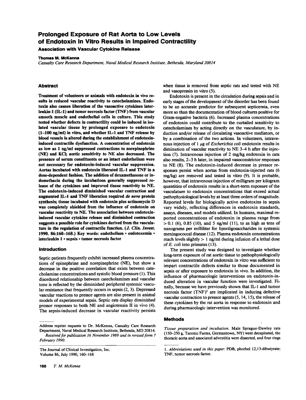 Treatment of volunteers or animals with endotoxin in vivo results in reduced vascular reactivity to catecholamines. Endotoxin also causes liberation of the vasoactive cytokines interleukin-1 (IL-1) and tumor necrosis factor (TNF) from vascular smooth muscle and endothelial cells in culture. This study tested whether defects in contractility could be induced in isolated vascular tissue by prolonged exposure to endotoxin (1-100 ng/ml) in vitro, and whether IL-1 and TNF release by blood vessels is altered during the establishment of endotoxin induced contractile dysfunction. A concentration of endotoxin as low as 1 ng/ml suppressed contractions to norepinephrine (NE) and KCl; aortic sensitivity to NE also decreased. The presence of serum constituents or an intact endothelium were not necessary for endotoxin-induced vascular suppression. Aortas incubated with endotoxin liberated IL-1 and TNF in a dose-dependent fashion. The addition of dexamethasone or indomethacin during the incubations generally suppressed release of the cytokines and improved tissue reactivity to NE. The endotoxin-induced diminished vascular contraction and augmented IL-1 and TNF liberation required de novo protein synthesis; tissue incubated with endotoxin plus actinomycin D was completely shielded from the influence of endotoxin on vascular reactivity to NE. The association between endotoxin-induced vascular cytokine release and diminished contraction suggests a possible role for cytokines derived from the vasculature in the regulation of contractile function.