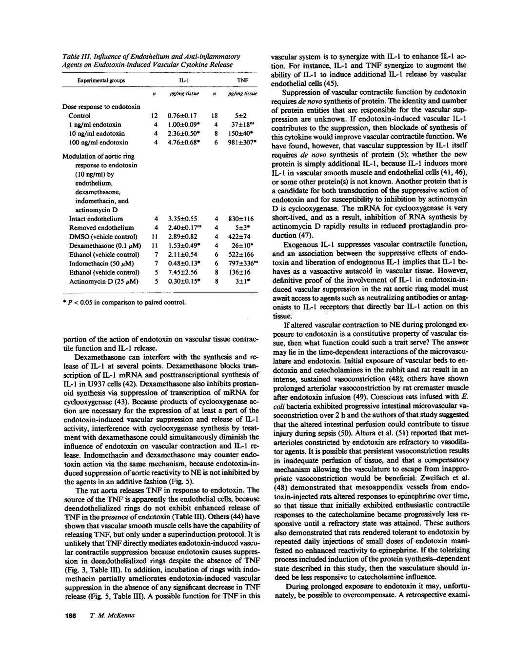 Treatment of volunteers or animals with endotoxin in vivo results in reduced vascular reactivity to catecholamines. Endotoxin also causes liberation of the vasoactive cytokines interleukin-1 (IL-1) and tumor necrosis factor (TNF) from vascular smooth muscle and endothelial cells in culture. This study tested whether defects in contractility could be induced in isolated vascular tissue by prolonged exposure to endotoxin (1-100 ng/ml) in vitro, and whether IL-1 and TNF release by blood vessels is altered during the establishment of endotoxin induced contractile dysfunction. A concentration of endotoxin as low as 1 ng/ml suppressed contractions to norepinephrine (NE) and KCl; aortic sensitivity to NE also decreased. The presence of serum constituents or an intact endothelium were not necessary for endotoxin-induced vascular suppression. Aortas incubated with endotoxin liberated IL-1 and TNF in a dose-dependent fashion. The addition of dexamethasone or indomethacin during the incubations generally suppressed release of the cytokines and improved tissue reactivity to NE. The endotoxin-induced diminished vascular contraction and augmented IL-1 and TNF liberation required de novo protein synthesis; tissue incubated with endotoxin plus actinomycin D was completely shielded from the influence of endotoxin on vascular reactivity to NE. The association between endotoxin-induced vascular cytokine release and diminished contraction suggests a possible role for cytokines derived from the vasculature in the regulation of contractile function.