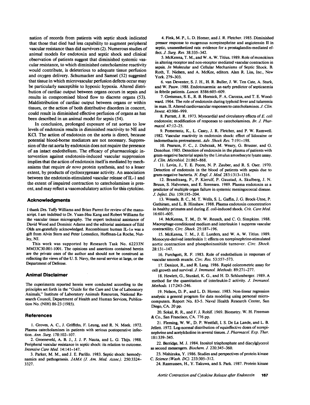 Treatment of volunteers or animals with endotoxin in vivo results in reduced vascular reactivity to catecholamines. Endotoxin also causes liberation of the vasoactive cytokines interleukin-1 (IL-1) and tumor necrosis factor (TNF) from vascular smooth muscle and endothelial cells in culture. This study tested whether defects in contractility could be induced in isolated vascular tissue by prolonged exposure to endotoxin (1-100 ng/ml) in vitro, and whether IL-1 and TNF release by blood vessels is altered during the establishment of endotoxin induced contractile dysfunction. A concentration of endotoxin as low as 1 ng/ml suppressed contractions to norepinephrine (NE) and KCl; aortic sensitivity to NE also decreased. The presence of serum constituents or an intact endothelium were not necessary for endotoxin-induced vascular suppression. Aortas incubated with endotoxin liberated IL-1 and TNF in a dose-dependent fashion. The addition of dexamethasone or indomethacin during the incubations generally suppressed release of the cytokines and improved tissue reactivity to NE. The endotoxin-induced diminished vascular contraction and augmented IL-1 and TNF liberation required de novo protein synthesis; tissue incubated with endotoxin plus actinomycin D was completely shielded from the influence of endotoxin on vascular reactivity to NE. The association between endotoxin-induced vascular cytokine release and diminished contraction suggests a possible role for cytokines derived from the vasculature in the regulation of contractile function.