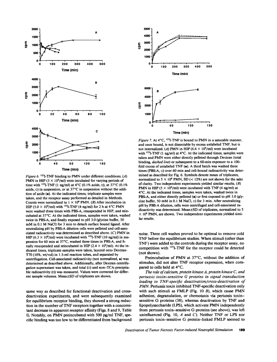 Despite numerous reports, the role of tumor necrosis factor (TNF) in polymorphonuclear leukocyte (PMN) function remains controversial. We found TNF to be a potent, pertussis toxin-independent stimulator of PMN adhesion (ED50 2.6 pM). TNF-stimulated PMN under adherent conditions released up to 65% of their transcobalamine content (ED50 3.9 pM) and increased their burst activity 10-fold (ED50 3.2 pM) as measured by the hexose monophosphate shunt, whereas PMN held in suspension hardly degranulated at all and only little burst activity was demonstrable. However, preincubation of PMN with TNF in suspension led to a decrease in cellular adhesiveness, degranulation, and burst activity in response to a secondary stimulus of TNF under adherent conditions, although cells remained fully responsive toward phorbol myristate acetate. A concomitant dose-dependent decline of TNF receptor numbers that correlated well with the inhibition of PMN function (r = 0.91) suggests receptor down-regulation as the mechanism of functional PMN deactivation. Remarkably, preincubation with other PMN stimuli such as N-formyl-methionyl-leucyl-phenylalanine, platelet-activating factor, leukotriene B4, complement component fragment 5a (C5a)/C5a (desarginated), and endotoxin also led to a reduction of TNF-specific PMN responses (cross-deactivation) from 35% (LTB4) to 90% (endotoxin), corresponding with the down-regulation of TNF receptors. Deactivation and receptor down-regulation are independent of pertussis toxin-sensitive G proteins and protein kinase C but seemed to depend on changes in calcium metabolism. Granulocyte hyporesponsiveness towards TNF in sepsis (with elevated blood levels of endotoxin and TNF) might be a mechanism of self-protection or, to the contrary, might impair a possibly central mode of host defense.