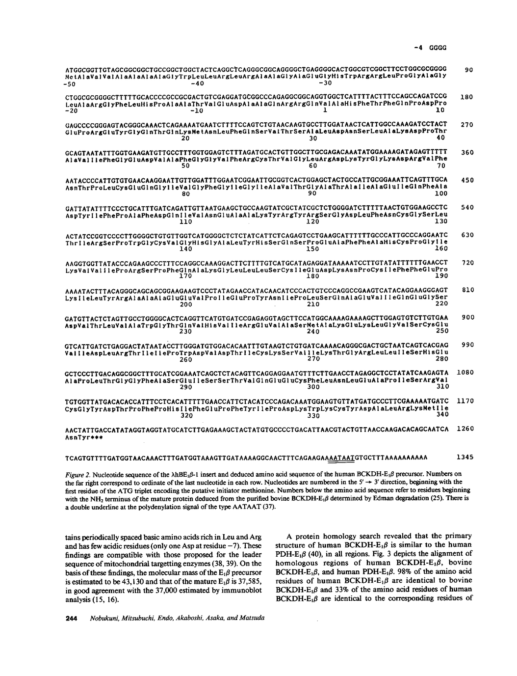A defect in the E1 beta subunit of the branched chain alpha-ketoacid dehydrogenase (BCKDH) complex is one cause of maple syrup urine disease (MSUD). In an attempt to elucidate the molecular basis of MSUD, we isolated and characterized a 1.35 kbp cDNA clone encoding the entire precursor of the E1 beta subunit of BCKDH complex from a human placental cDNA library. Nucleotide sequence analysis revealed that the isolated cDNA clone (lambda hBE1 beta-1) contained a 5'-untranslated sequence of four nucleotides, the translated sequence of 1,176 nucleotides and the 3'-untranslated sequence of 169 nucleotides. Comparison of the amino acid sequence predicted from the nucleotide sequence of the cDNA insert of the clone with the NH2-terminal amino acid sequence of the purified mature bovine BCKDH-E1 beta subunit showed that the cDNA insert encodes for a 342-amino acid subunit with a Mr = 37,585. The subunit is synthesized as the precursor with a leader sequence of 50 amino acids and is processed at the NH2 terminus. A search for protein homology revealed that the primary structure of human BCKDH-E1 beta was similar to the bovine BCKDH-E1 beta and to the E1 beta subunit of human pyruvate dehydrogenase complex, in all regions. The structures and functions of mammalian alpha-ketoacid dehydrogenase complexes are apparently highly conserved. Genomic DNA from lymphoblastoid cell lines derived from normal and five MSUD patients, in whom E1 beta was not detected by immunoblot analysis, gave the same restriction maps on Southern blot analysis. The gene has at least 80 kbp.
