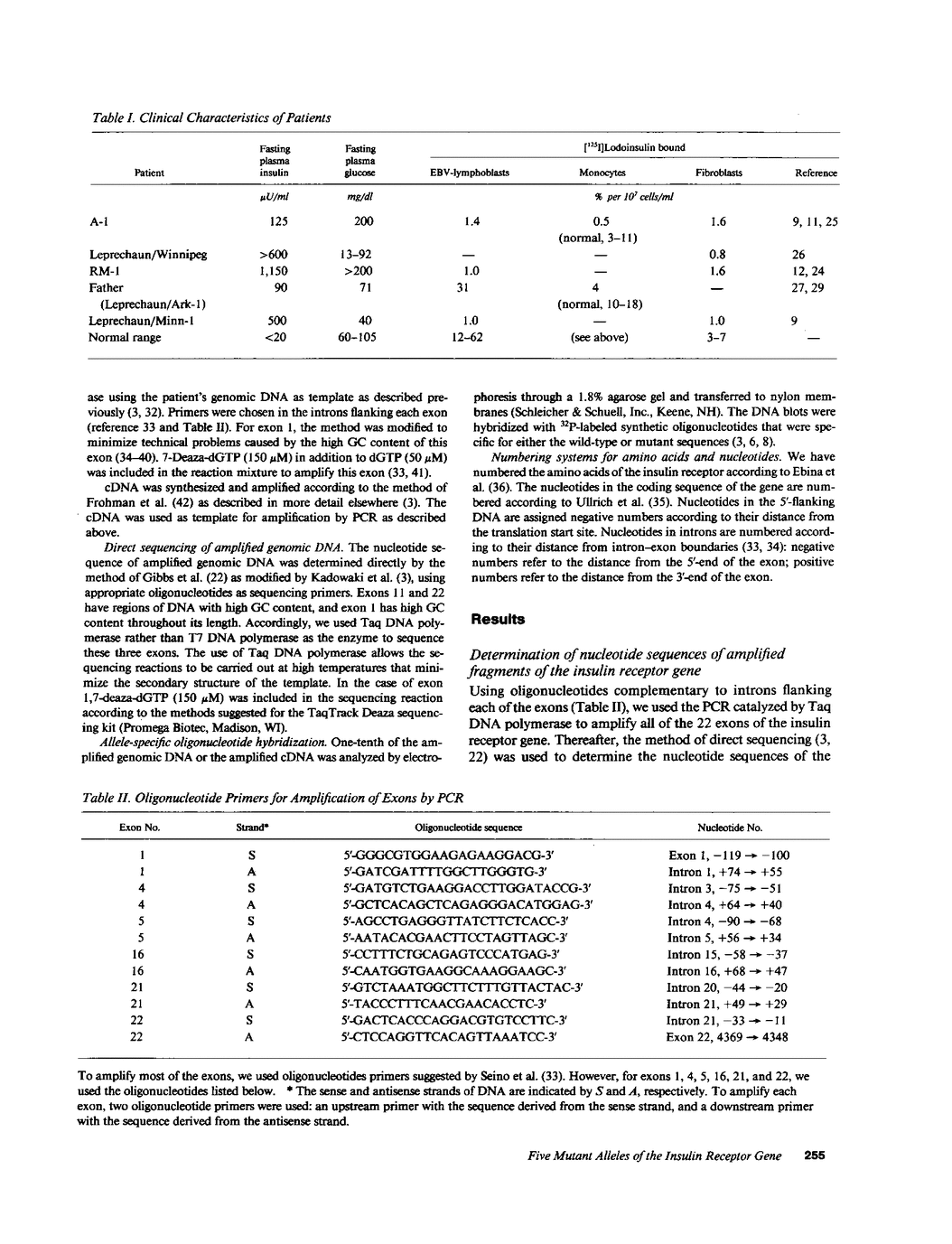 The nucleotide sequence was determined for all 22 exons of the insulin receptor gene from three patients with genetic syndromes associated with extreme insulin resistance. In all three patients, insulin resistance was caused by decreased insulin binding to the cell surface. The patient with leprechaunism (leprechaun/Winnipeg) came from a consanguineous pedigree and was homozygous for a missense mutation substituting arginine for His209 in the alpha-subunit of the insulin receptor. The other two patients were both compound heterozygotes with a nonsense mutation in one allele of the insulin receptor gene, and a missense mutation in the other allele. In the patient with the Rabson-Mendenhall syndrome (patient RM-1), the missense mutation substituted lysine for Asn15 in the alpha-subunit. In the patient with type A extreme insulin resistance (patient A-1), the missense mutation substituted serine for Asn462 in the alpha-subunit. Both nonsense mutations markedly reduced the levels of insulin receptor mRNA transcribed from the alleles with the nonsense mutation as compared to the transcripts from the other allele. The reduction in the level of mRNA would be predicted to greatly reduce the rate at which the truncated receptors would be synthesized. Furthermore, the truncated receptors would be severely impaired in their ability to mediate insulin action.