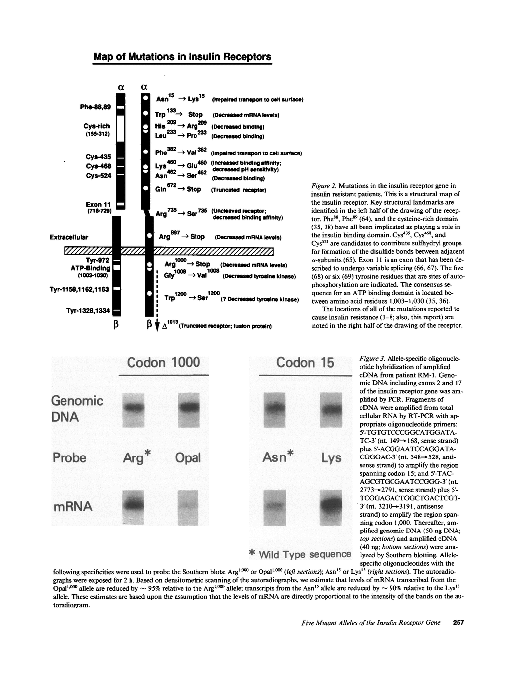 The nucleotide sequence was determined for all 22 exons of the insulin receptor gene from three patients with genetic syndromes associated with extreme insulin resistance. In all three patients, insulin resistance was caused by decreased insulin binding to the cell surface. The patient with leprechaunism (leprechaun/Winnipeg) came from a consanguineous pedigree and was homozygous for a missense mutation substituting arginine for His209 in the alpha-subunit of the insulin receptor. The other two patients were both compound heterozygotes with a nonsense mutation in one allele of the insulin receptor gene, and a missense mutation in the other allele. In the patient with the Rabson-Mendenhall syndrome (patient RM-1), the missense mutation substituted lysine for Asn15 in the alpha-subunit. In the patient with type A extreme insulin resistance (patient A-1), the missense mutation substituted serine for Asn462 in the alpha-subunit. Both nonsense mutations markedly reduced the levels of insulin receptor mRNA transcribed from the alleles with the nonsense mutation as compared to the transcripts from the other allele. The reduction in the level of mRNA would be predicted to greatly reduce the rate at which the truncated receptors would be synthesized. Furthermore, the truncated receptors would be severely impaired in their ability to mediate insulin action.
