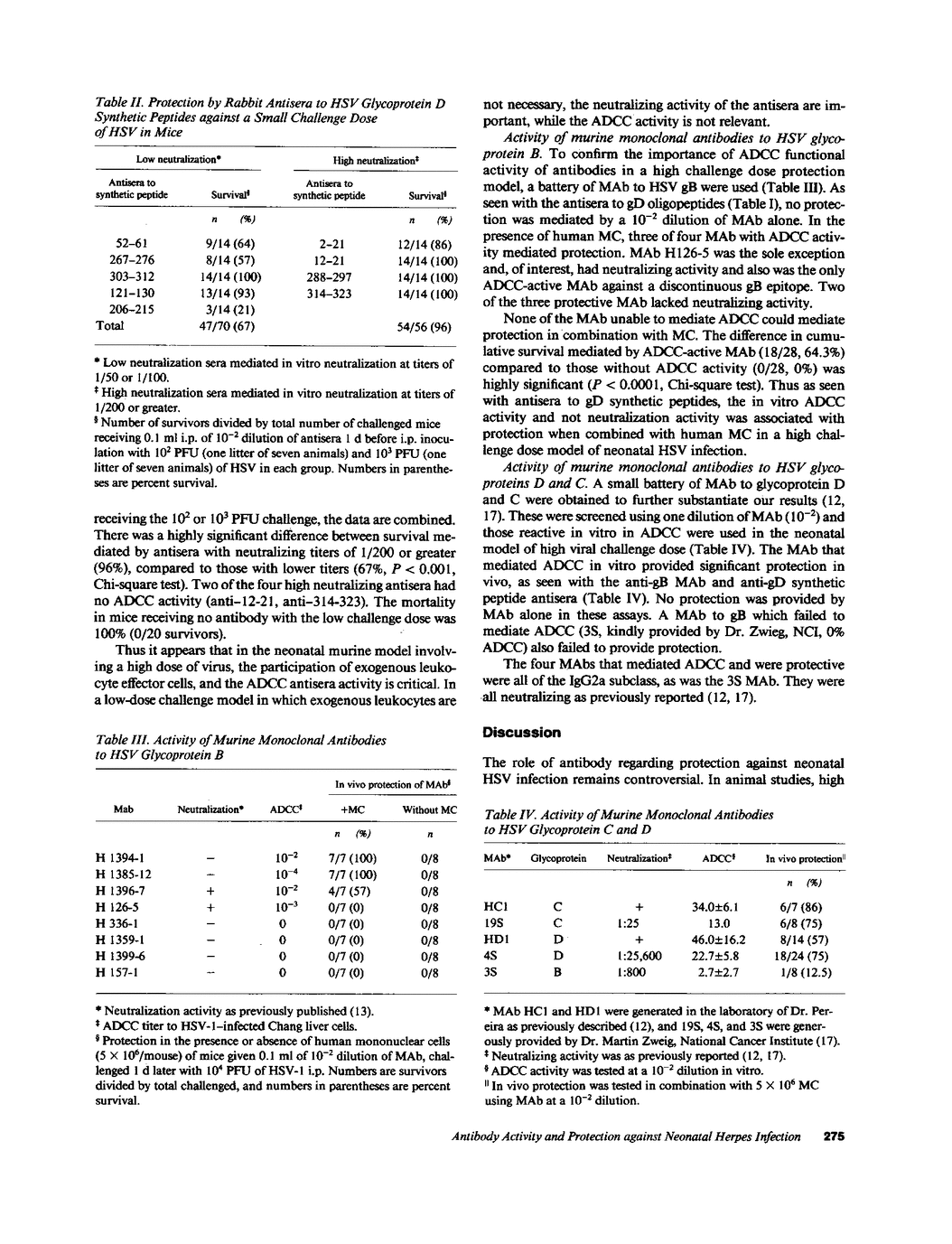 The role of antibody in neonatal herpes simplex virus (HSV) infection remains controversial. A battery of well-characterized monoclonal antibodies to HSV glycoprotein B (gB), and polyclonal antibodies against synthetic peptides of predicted epitopes of HSV glycoprotein D (gD) were used to determine in vitro functional activity and association with protection against lethal infection in a murine model of neonatal HSV disease. Antiviral neutralization activity of HSV was not associated with antibody-dependent cellular cytotoxicity (ADCC) activity to HSV-infected cells in vitro. In a model of high dose challenge (10(4) PFU), protection was not afforded by any antibody alone, but was by antibody plus human mononuclear cells, and highly associated with ADCC functional activity (P less than 0.001). In a low dose challenge model, neutralizing activity of antibody alone was associated with protection in vivo (P less than 0.001). Of the nine neutralizing epitopes of gD in vitro, eight were predicted surface regions. Four of the five epitopic sites of gD (2-21, 267-276, 288-297, and 303-312) that were determined to be important targets of ADCC and in vivo protection were also predicted to be surface regions. The only exception was the antiserum to region 52-61 which was predicted to be buried and also showed these activities. ADCC as well as neutralizing antibody activity are important in protection against neonatal HSV infection.