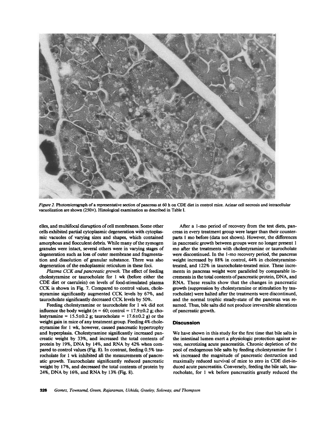 Bile salts in the intestinal lumen act to inhibit the release of cholecystokinin (CCK). Recent studies have shown that CCK may play a permissive role in the development of acute pancreatitis. In this study, the amount of luminal bile salts in female Swiss Webster mice was either decreased by feeding 4% (wt/wt) cholestyramine or increased by feeding 0.5% sodium taurocholate for 1 wk. Plasma levels of CCK were stimulated by cholestyramine and inhibited by taurocholate. Then, acute pancreatitis was induced either by caerulein injections, or by feeding a choline-deficient, ethionine-supplemented (CDE) diet. Feeding of cholestyramine significantly decreased survival from 25% to 0% in the CDE pancreatitis, and increased the magnitude of elevation of serum amylase levels and the extent of pancreatic necrosis in both models of pancreatitis; CCK-receptor blockade with CR-1409 completely abolished the adverse effects of cholestyramine. In contrast, feeding of taurocholate significantly increased survival to 100% and decreased the elevation of serum amylase and pancreatic necrosis; CCK-8 antagonized these actions of taurocholate. Luminal bile salts appear to provide a physiologic protection against necrotizing pancreatitis, at least in part, both by inhibiting the release of CCK and by promoting resistance of the pancreas to CCK excessive stimulation in vivo.