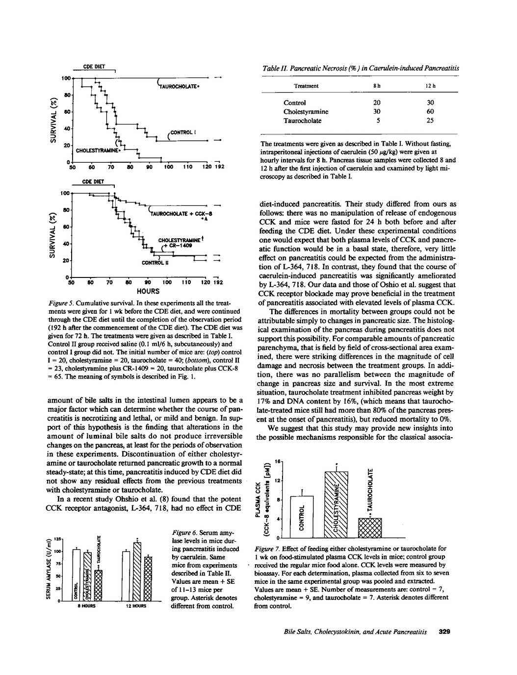 Bile salts in the intestinal lumen act to inhibit the release of cholecystokinin (CCK). Recent studies have shown that CCK may play a permissive role in the development of acute pancreatitis. In this study, the amount of luminal bile salts in female Swiss Webster mice was either decreased by feeding 4% (wt/wt) cholestyramine or increased by feeding 0.5% sodium taurocholate for 1 wk. Plasma levels of CCK were stimulated by cholestyramine and inhibited by taurocholate. Then, acute pancreatitis was induced either by caerulein injections, or by feeding a choline-deficient, ethionine-supplemented (CDE) diet. Feeding of cholestyramine significantly decreased survival from 25% to 0% in the CDE pancreatitis, and increased the magnitude of elevation of serum amylase levels and the extent of pancreatic necrosis in both models of pancreatitis; CCK-receptor blockade with CR-1409 completely abolished the adverse effects of cholestyramine. In contrast, feeding of taurocholate significantly increased survival to 100% and decreased the elevation of serum amylase and pancreatic necrosis; CCK-8 antagonized these actions of taurocholate. Luminal bile salts appear to provide a physiologic protection against necrotizing pancreatitis, at least in part, both by inhibiting the release of CCK and by promoting resistance of the pancreas to CCK excessive stimulation in vivo.