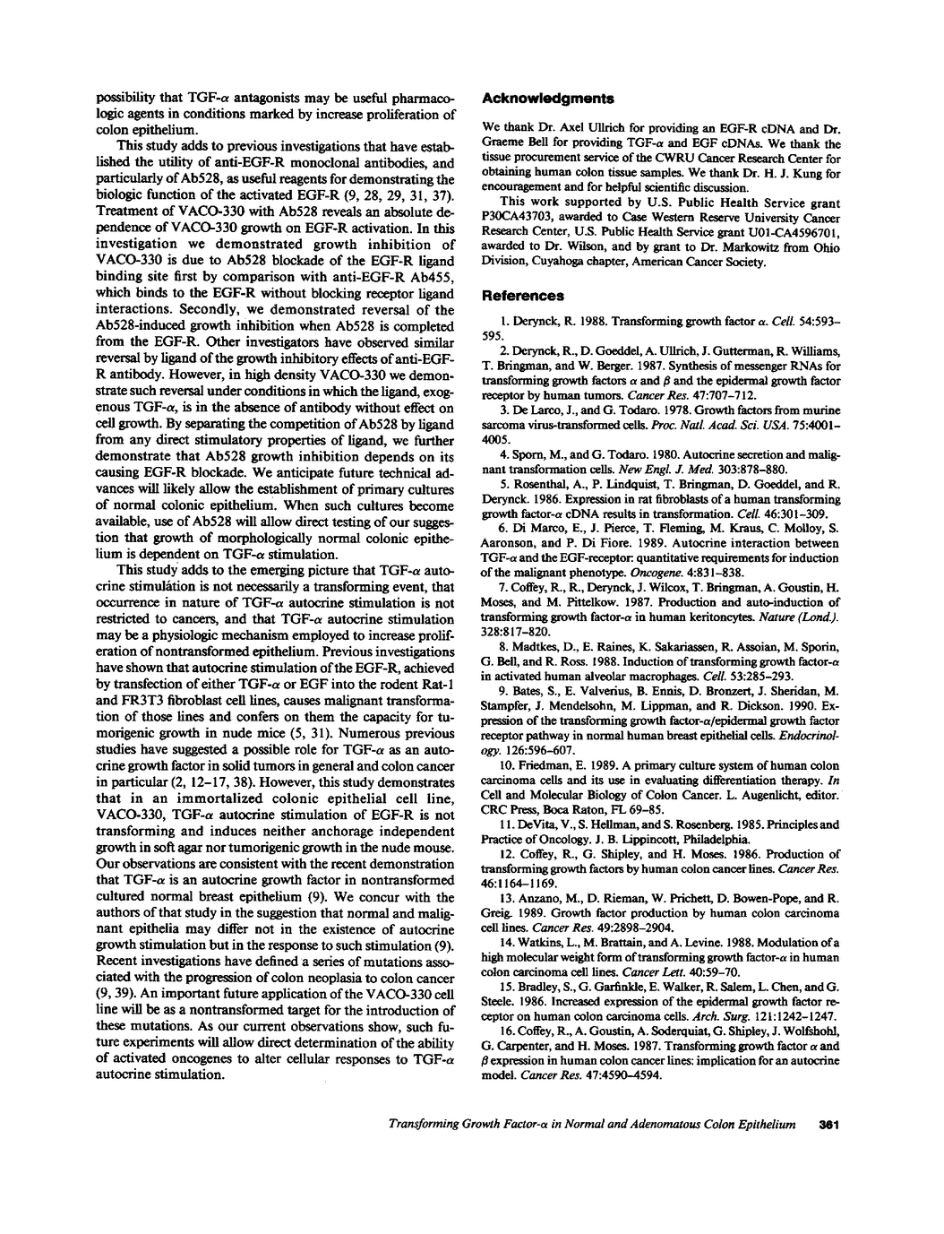 Autocrine stimulation of the epidermal growth factor receptor (EGF-R), by coexpression of transforming growth factor-alpha (TGF-alpha), causes malignant transformation of some fibroblast cell lines. TGF-alpha and EGF-R are both known to be expressed in colon carcinoma tissue and have been shown coexpressed in colon carcinoma cell lines. TGF-alpha autocrine activation of EGF-R has been suggested as a potential mechanism contributing to abnormal growth control in colon cancer. We now report coexpression of TGF-alpha and EGF-R transcripts in morphologically normal colonic epithelium from five individuals, in colonic adenomas from three individuals, and in a nontumorigenic colon adenoma cell line, VACO-330. Functional studies demonstrate VACO-330 growth is stimulated by exogenous TGF-alpha and is completely abolished by a blocking anti-EGF-R antibody. Autocrine stimulation of EGF-R by TGF-alpha is therefore required for growth of the adenoma cell line. Autocrine stimulation of EGF-R by TGF-alpha does not cause malignant transformation of the colonic epithelial cell. In normal and adenomatous human colon TGF-alpha, via either an autocrine or paracrine mechanism, is likely an important physiologic stimulant of epithelial proliferation.