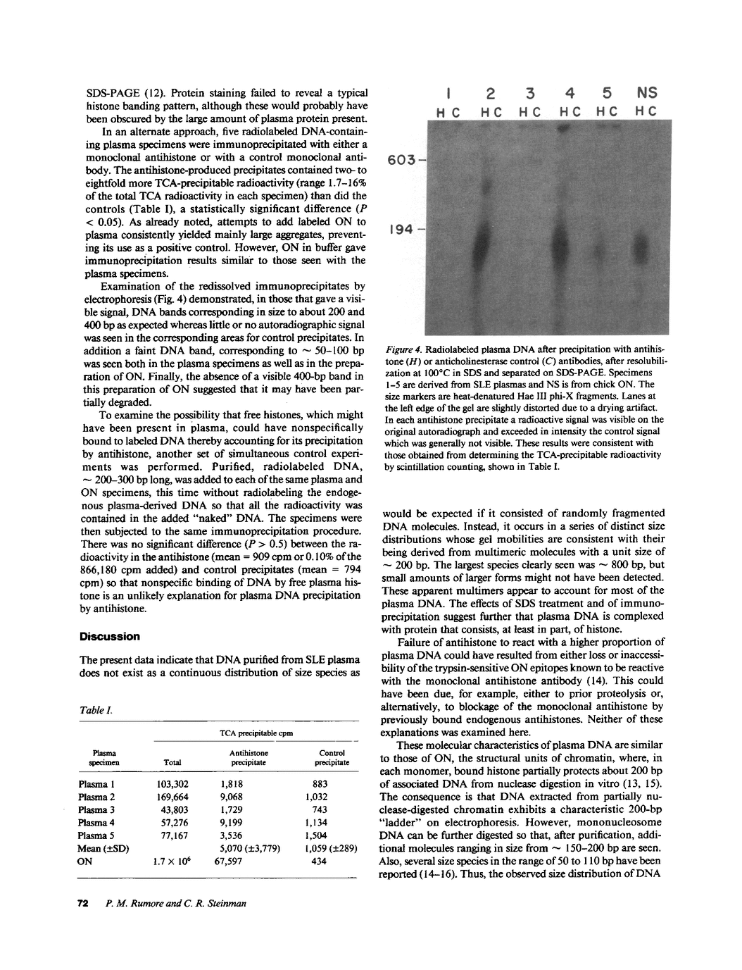 Little is known about endogenous systemic lupus erythematosus (SLE) plasma DNA even though it is the presumed precursor of DNA-containing immune complexes, thought to play a central role in lupus glomerulonephritis. DNA purified from SLE plasma formed discrete bands, corresponding to sizes of about 150-200, 400, 600, and 800 bp, closely resembling the characteristic 200 bp "ladder" found with oligonucleosomal (ON) DNA. By radiolabeling DNA while in whole plasma, the very small amounts present could be further characterized. All of 24 such specimens formed two or more discrete bands on 6% PAGE. Detergent treatment of plasma resulted in a DNA migration pattern similar to that of purified DNA, suggesting disruption of DNA-protein complexes. DNA purified from authentic ON and detergent-treated ON behaved similarly. A significant portion of DNA, labeled in SLE plasma could be specifically immunoprecipitated with monoclonal antihistone antibody as was the case with ON. These immunoprecipitates, when redissolved, exhibited the expected size distribution upon PAGE. It is concluded that DNA in SLE plasma occurs as a series of multimeric complexes, at least a portion of which is noncovalently bound to histone. These results are consistent with an ON-like structure for SLE plasma DNA as had been suggested by theoretical considerations and may have important implications for its immunologic behavior in SLE and perhaps other disorders.