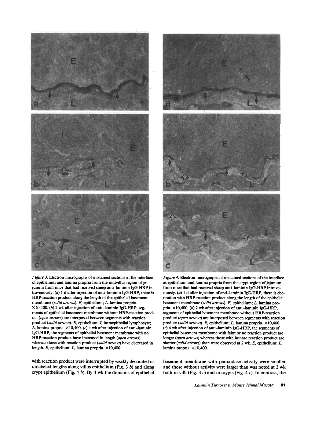 Little is known regarding turnover of the epithelial basement membrane in adult small intestine. Are components degraded and inserted along the length of the crypt-villus axis or selectively in the crypt region with subsequent migration of basement membrane from crypt to villus tip in concert with epithelium? We injected affinity-purified sheep anti-laminin IgG or sheep anti-laminin IgG complexed to horseradish peroxidase (HRP) into mice to label basement membrane laminin in vivo. Fluorescence microscopy revealed linear fluorescence along the length of the jejunal epithelial basement membrane 1 d after anti-laminin IgG injection. By 1 wk, small nonfluorescent domains were interposed between larger fluorescent domains. Over the next 5 wk the lengths of nonfluorescent domains increased progressively whereas those of fluorescent domains decreased. Additionally, electron microscopy revealed HRP reaction product along the length of the epithelial basement membrane after 1 d whereas unlabeled or lightly labeled domains that increased in length with time were observed interposed between heavily labeled domains by 2 and 4 wk along the entire crypt-villus axis. We conclude that laminin turnover occurs focally in the epithelial basement membrane of mouse jejunum along the crypt-villus axis over a period of weeks and that this basement membrane does not comigrate in concert with its overlying epithelium.