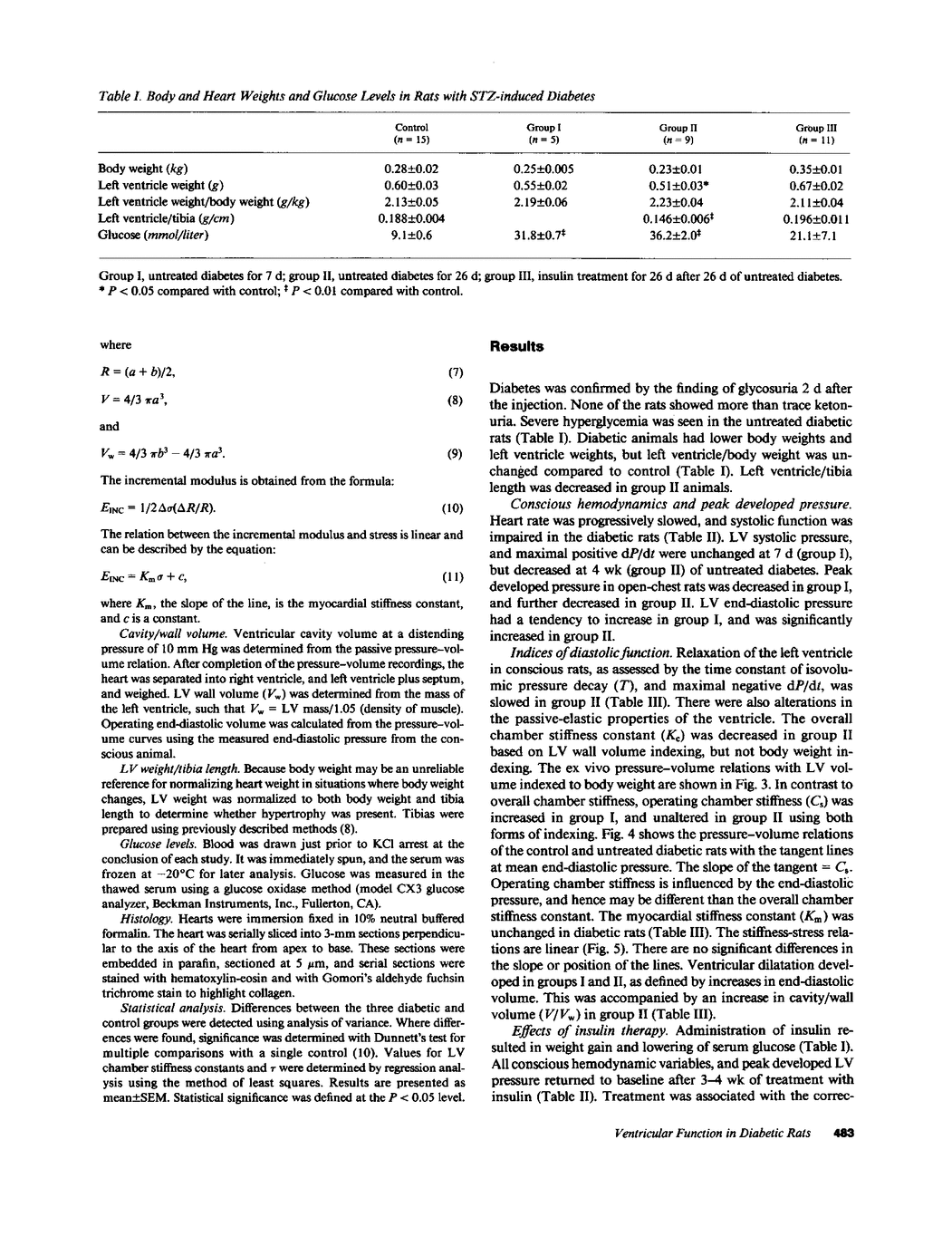 To provide an integrated assessment of changes in systolic and diastolic function in diabetic rats, we measured conscious hemodynamics and performed ex vivo analysis of left ventricular passive-elastic properties. Rats given streptozotocin (STZ) 65 mg/kg i.v. (n = 14) were compared with untreated age-matched controls (n = 15) and rats treated with insulin after administration of STZ (n = 11). After 7 d, diabetic rats exhibited decreases in heart rate and peak developed left ventricular (LV) pressure during aortic occlusion. After 26 d of diabetes there were significant decreases in resting LV systolic pressure, developed pressure, and maximal +dP/dt, whereas LV end-diastolic pressure increased and the time constant of LV relaxation was prolonged. The passive LV pressure-volume relationship was progressively shifted away from the pressure axis, and the overall chamber stiffness constant was decreased. However, "operating chamber stiffness" calculated at end-diastolic pressure was increased at 7 d, and unchanged at 26 d. LV cavity/wall volume and end-diastolic volume were increased after 26 d of diabetes. Myocardial stiffness was unchanged at both time intervals. All of the above abnormalities were reversed by the administration of insulin. We conclude that the hemodynamic and passive-elastic changes that occur in diabetic rats represent an early dilated cardiomyopathy which is reversible with insulin.