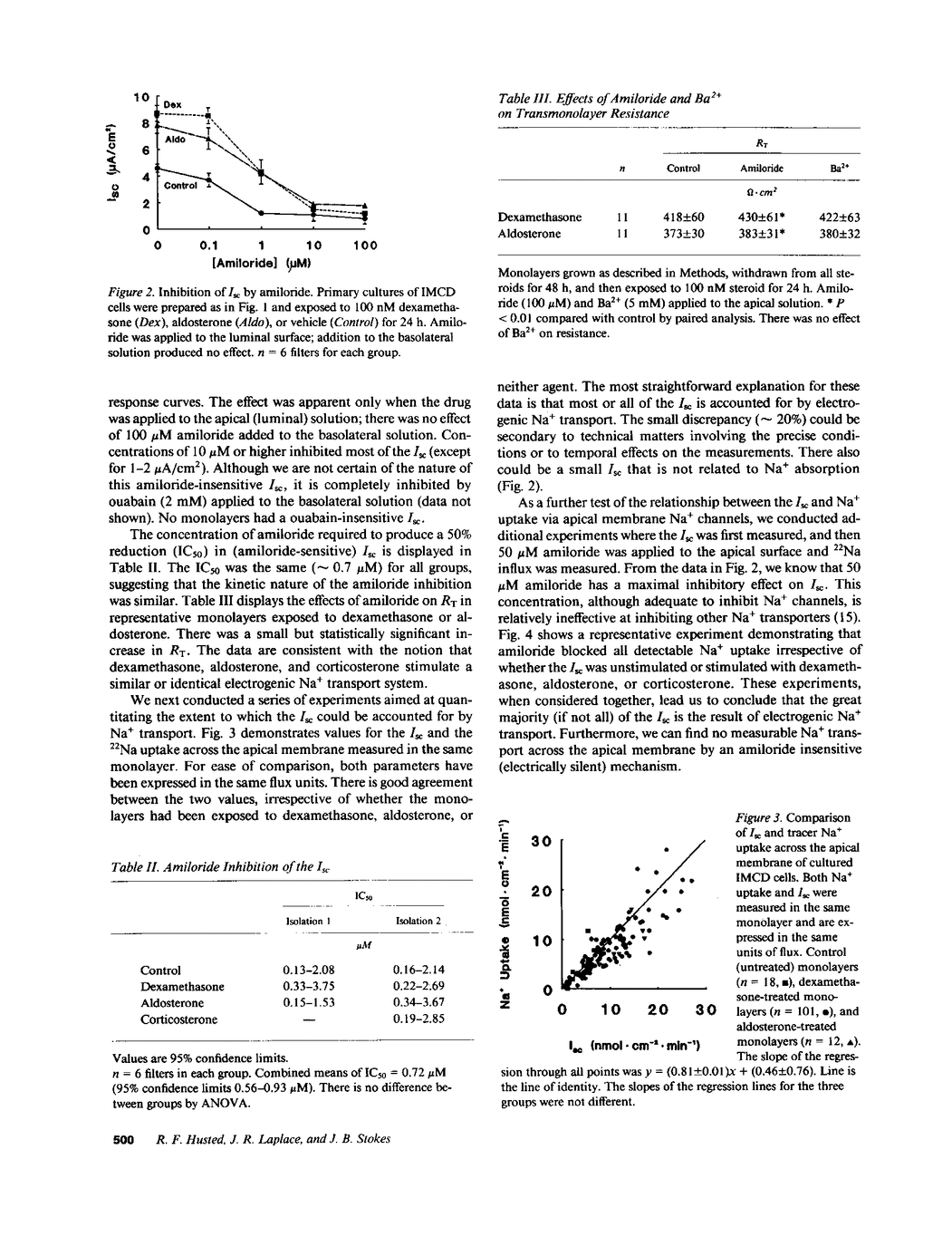 We have investigated the effect of steroid hormones on Na+ transport by rat renal inner medullary collecting duct (IMCD) cells. These cells, grown on permeable supports in primary culture, grow to confluence and develop a transmonolayer voltage oriented such that the apical surface is negative with respect to the basal surface. The results of these experiments demonstrate that this voltage is predominantly (or exclusively) the result of electrogenic Na+ absorption. Na+ transport can be stimulated two- to fourfold by exposure to either dexamethasone or aldosterone (100 nM). Experiments using specific antagonists of the glucocorticoid and mineralocorticoid receptors indicate that activation of either receptor stimulates electrogenic Na+ transport; electroneutral Na+ transport is undetectable. Two other features of the IMCD emerge from these studies. (a) These cells appear to have the capacity to metabolize the naturally occurring glucocorticoid hormone corticosterone. (b) The capacity for K+ secretion is minimal and steroid hormones do not induce or stimulate conductive K+ secretion as they do in the cortical collecting duct.