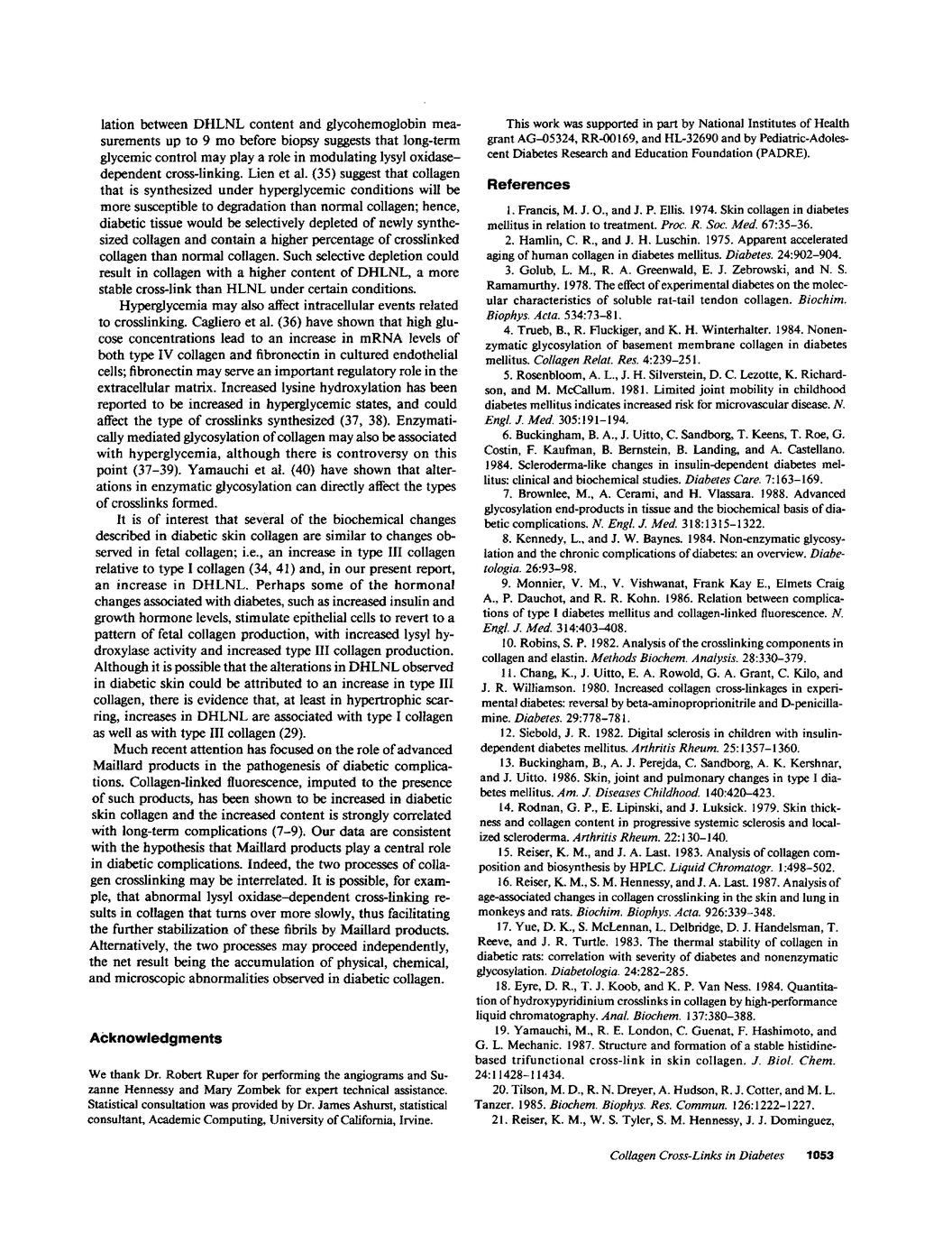 Many abnormalities in collagen have been reported in insulin-dependent diabetes mellitus, some or all of which have been attributed to increased cross-linking. Although recent work has focused on the role of glucose-derived collagen cross-links in the pathogenesis of diabetic complications, relatively few studies have investigated the role of lysyl oxidase-dependent (LOX) cross-links. In the present study, LOX cross-links and nonenzymatic glycosylation were quantified in skin collagen from diabetic subjects. There was an increase in the difunctional cross-link dihydroxylysinonorleucine (DHLNL) as well as in one of its trifunctional maturation products, hydroxypyridinium. All other LOX crosslinks were normal. Nonenzymatic glycosylation was increased in diabetic skin collagen, and this increase was correlated with increases in DHLNL (P less than 0.001). The biochemical results were examined for correlations with clinical data from the same subjects. Increases in DHLNL content were associated with duration of diabetes (P less than 0.003), glycohemoglobin levels (P less than 0.001), hand contractures (P less than 0.05), skin changes (P less than 0.005), and microalbuminuria (P less than 0.01). In nondiabetic subjects age was not correlated with collagen cross-link content with the exception that his-HLNL increased with age (r = 0.79, P less than 0.02). In diabetic subjects, PA levels decreased with age (r = 0.51, P less than 0.02). With increased duration of diabetes, DHLNL content was increased (r = 0.55, P less than 0.003) and OHP was increased (r = 0.59, P less than 0.01), whereas PA levels were decreased (r = -0.48, P less than 0.04). Nonenzymatic glycosylation of collagen was also increased with increased duration of diabetes (hex-lys, r = 0.47, P less than 0.02; hex-hyl, r = 0.39, P less than 0.05). We conclude that: (a) lysyl oxidase-dependent cross-linking is increased in skin collagen in diabetes and (b) that these changes in skin collagen are correlated with duration of diabetes, glycemic control, and long-term complications.