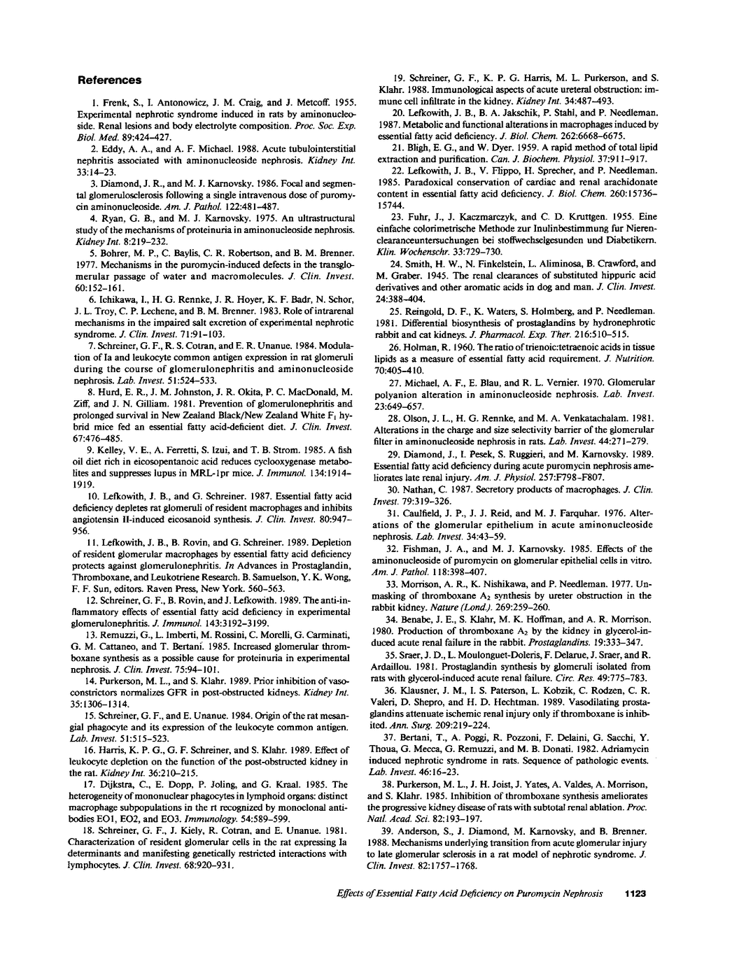 The administration of the aminonucleoside of puromycin (PAN) to rats causes the nephrotic syndrome that is associated with an acute decline in renal function, and an interstitial infiltrate. We examined whether essential fatty acid deficiency (EFAD), which inhibits macrophage infiltration in glomerulonephritis, affects PAN-induced renal dysfunction. Both control and EFAD rats developed proteinuria that resolved over 28 d. After PAN administration, there was a prominent infiltration of macrophages in rats fed a normal diet. The infiltrate was prevented by the EFAD diet. The absence of a macrophage interstitial infiltrate was associated with a significantly higher Cin in the EFAD rats than in controls at 7 d (5.21 +/- 1.19 versus 0.39 +/- 0.08, P less than 0.002 ml/min/kg BW). In addition, CPAH fell to less than 10 ml/min/kg BW by day 7 in controls, but remained the same as normal in the EFAD. After administration of PAN to control rats, there was no increase in urinary thromboxane excretion or an increase in glomerular thromboxane production. Furthermore, the effect of EFAD could not be mimicked by the administration of a thromboxane synthase inhibitor. Irradiation-induced leukopenia in rats on a normal diet markedly improved glomerular filtration and renal blood flow in acutely nephrotic rats. EFAD prevents the interstitial cellular infiltrate and the renal ischemia associated with experimental nephrosis. The recruitment of mononuclear cells into the kidney following PAN directly contributes to the decline in renal function.